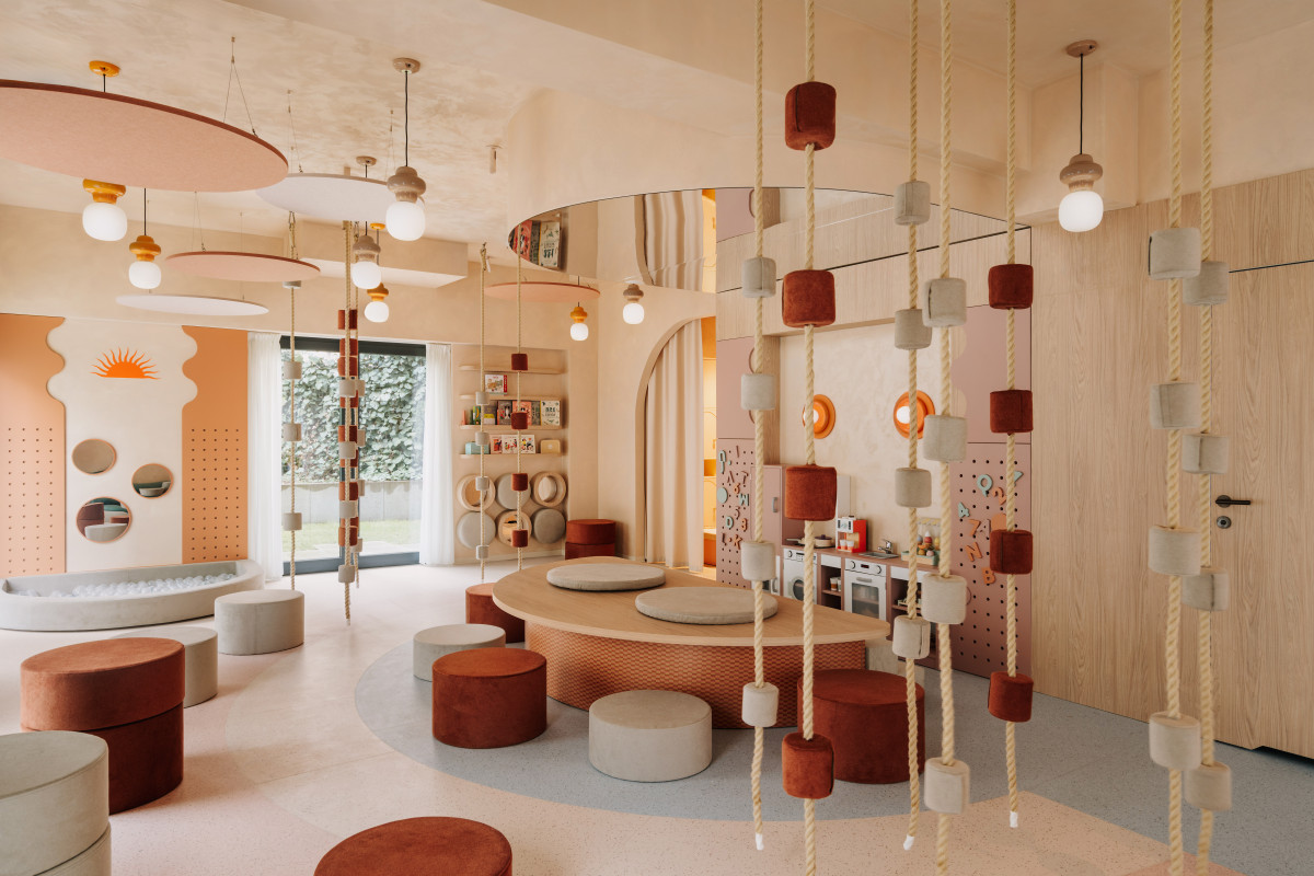 Architekci postawili na naturalne materiały jak drewno, forniry, kamień, filc i naturalne tynki. To wnętrze o ciepłym, sensorycznym charakterze, przyjazne zarówno dzieciom, jak i dorosłym. Wnętrze wyposażono meblami polskich marek, m.in. The Good Living czy NG Design. Meble zostały dobrane nie tylko z myślą o estetyce, ale również funkcjonalności: mają służyć zarówno komfortowi, jak i integracji użytkowników przestrzeni. Przestrzeń oświetlają lampy polskich projektantów, m.in. Anny Marciniszyn (NODI) i marki CHORS.