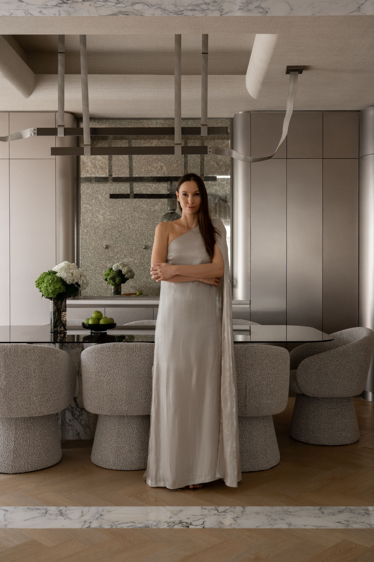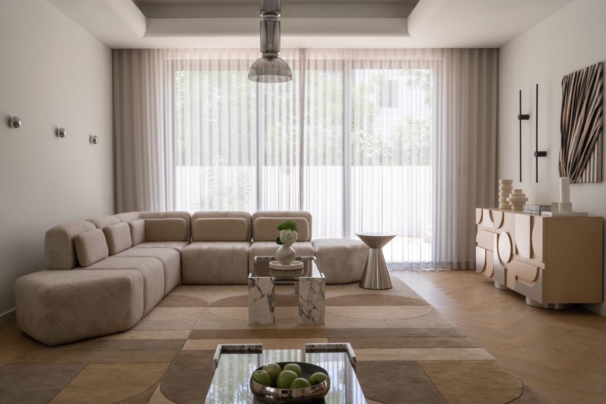 Barwione szkło zastosowane w blatach stołów, drzwiach kieszeniowych oraz elementach zabudowy, wnosi delikatne ciepło i rytm do całej aranżacji. Z kolei kwarc Caesarstone wybrano do kuchni i pralni ze względu na walory estetyczne, wytrzymałość i łatwość użytkowania. Na uwagę zasługuje też 8-metrowy dywan w salonie. Jak wspomina projektantka, dywan w odcieniach beżu i brązu z żółtymi akcentami został ręcznie utkany w Indiach.