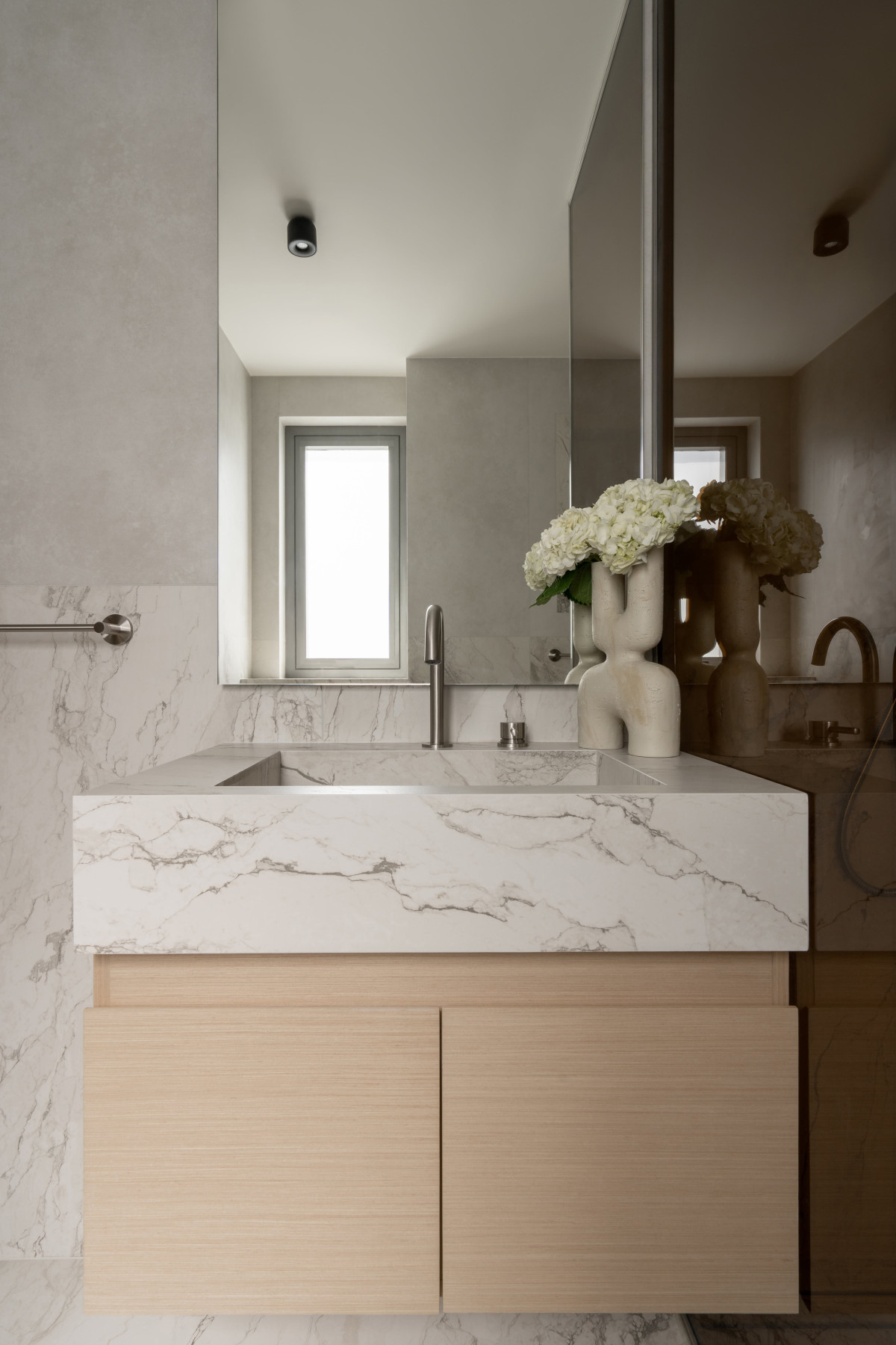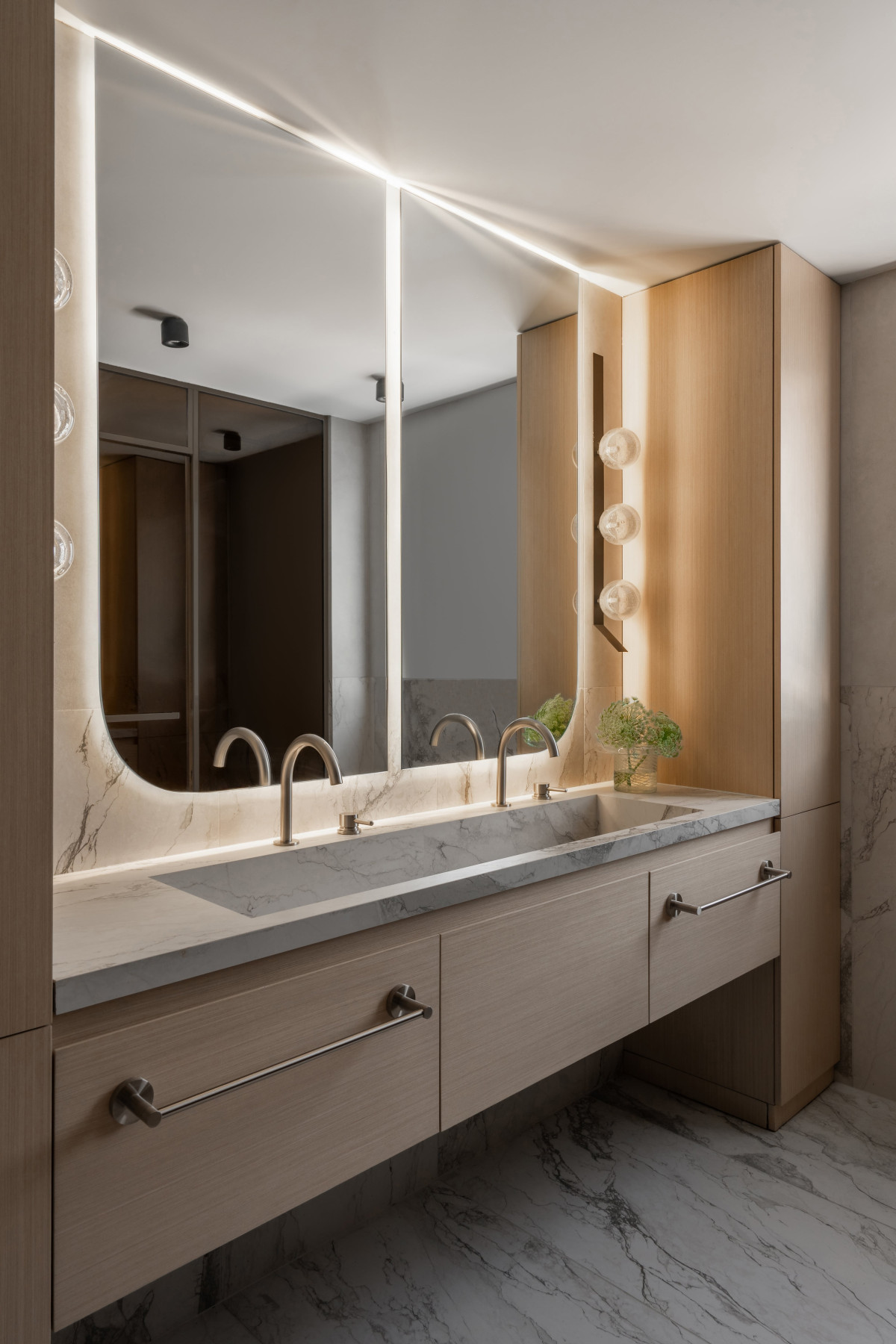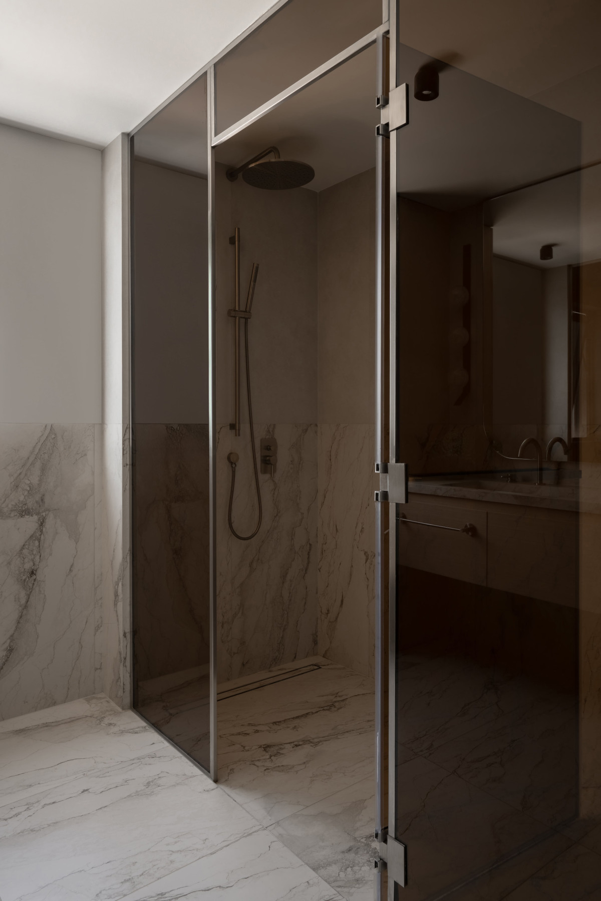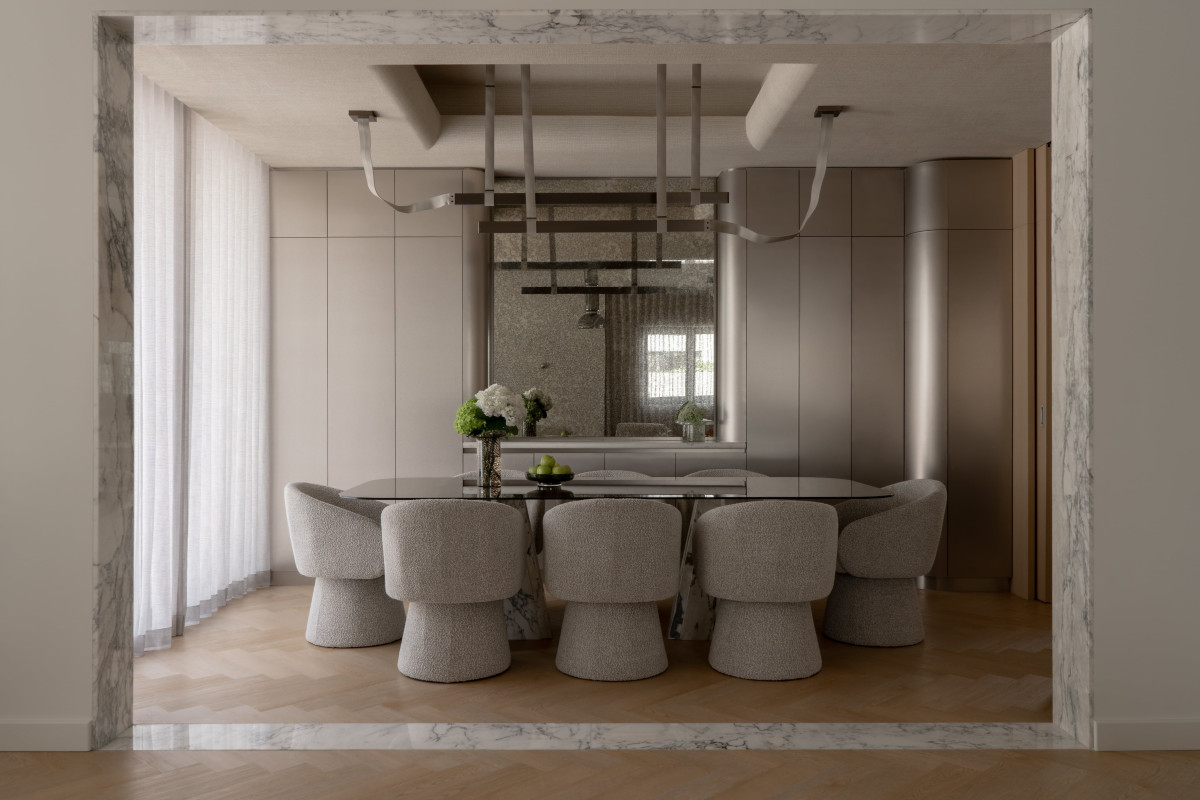Dębowe podłogi w jodełkę zakotwiczają przestrzeń i nadają jej ciepłego, domowego charakteru. Marmur Calacatta Vagil, pojawiający się w oprawach architektonicznych, zabudowach, detalach i meblach, razem ze stalą, akcentami z niklu szczotkowanego i czarnego metalu, wprowadzają do wnętrz subtelne kontrasty. Wykończenia z mikrocementu, nadające wnętrzu industrialnego sznytu, pojawiają się w głównej sypialni, garderobach i toalecie gościnnej.