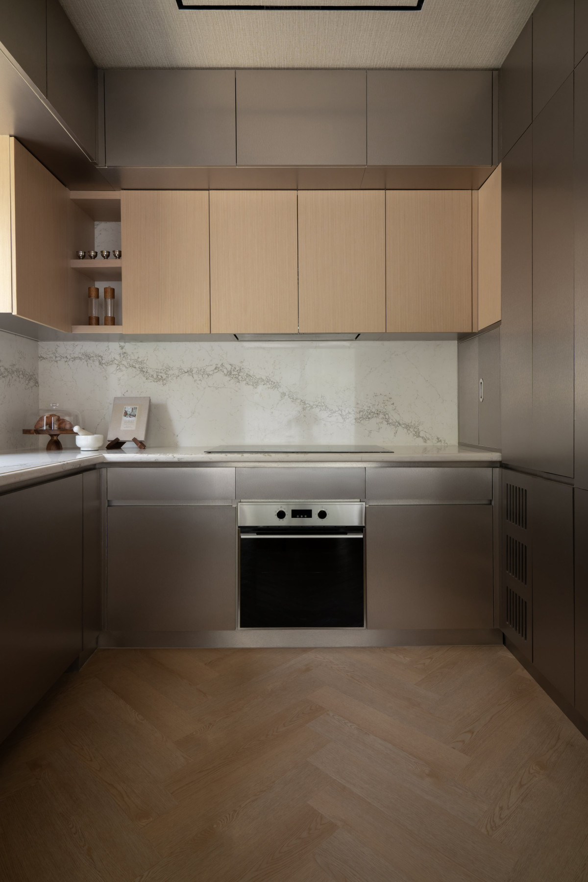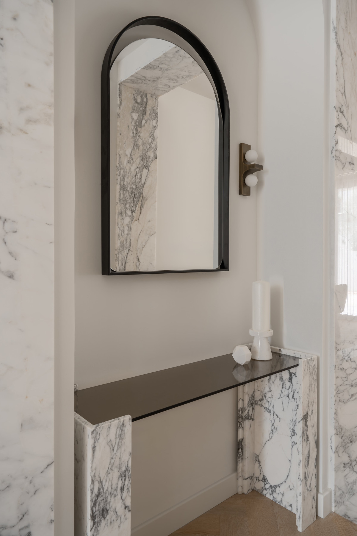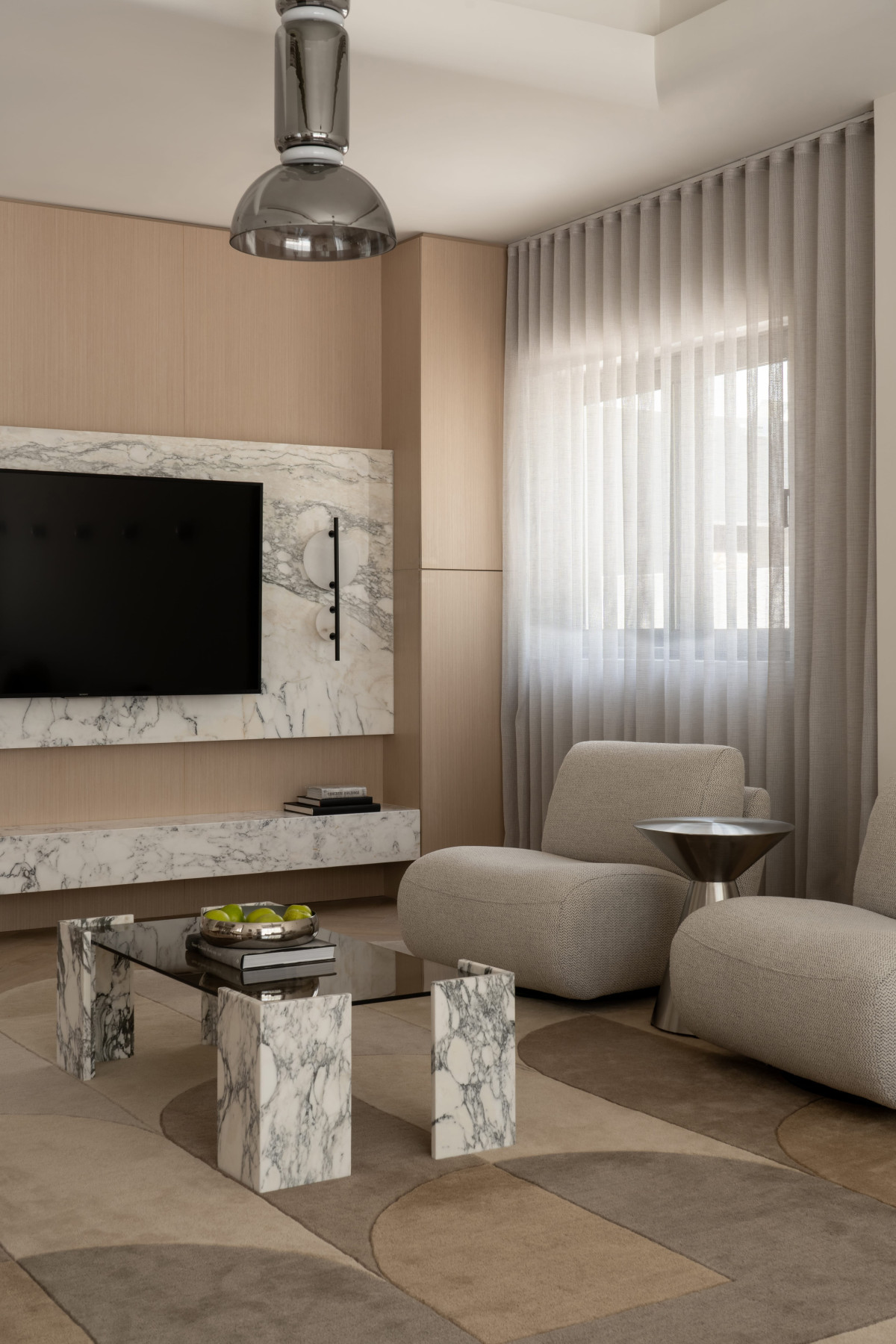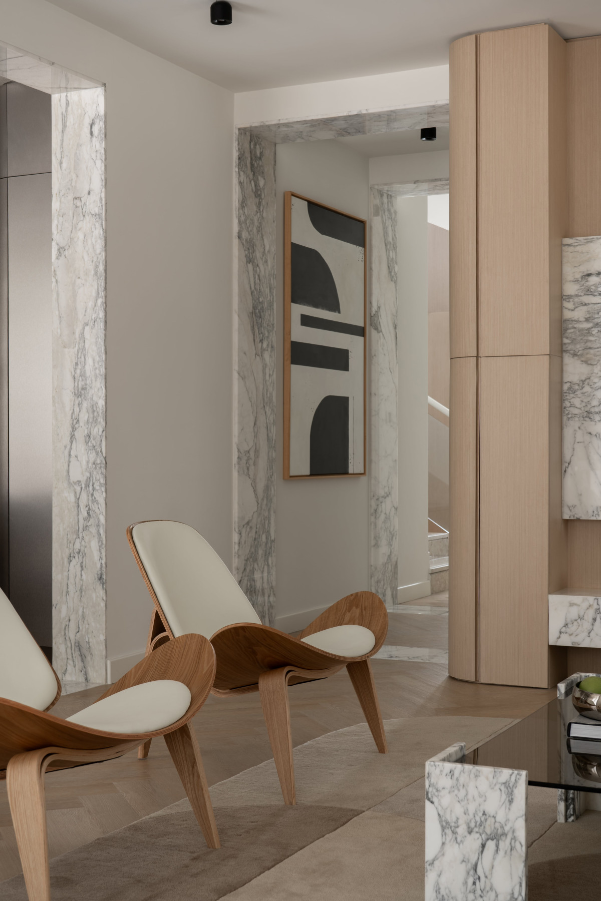 Dębowe podłogi w jodełkę zakotwiczają przestrzeń i nadają jej ciepłego, domowego charakteru. Marmur Calacatta Vagil, pojawiający się w oprawach architektonicznych, zabudowach, detalach i meblach, razem ze stalą, akcentami z niklu szczotkowanego i czarnego metalu, wprowadzają do wnętrz subtelne kontrasty. Wykończenia z mikrocementu, nadające wnętrzu industrialnego sznytu, pojawiają się w głównej sypialni, garderobach i toalecie gościnnej.