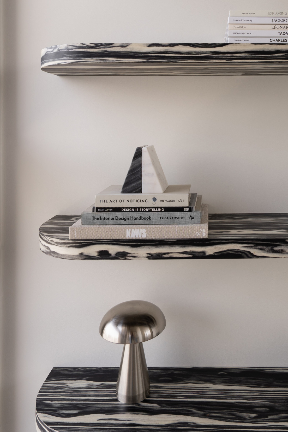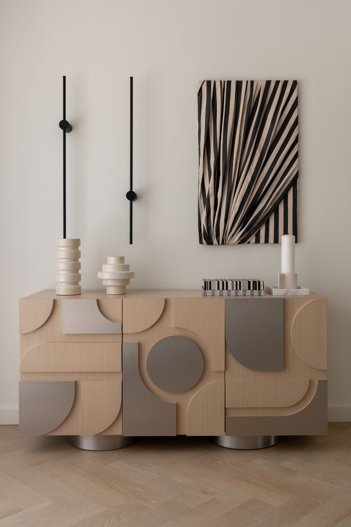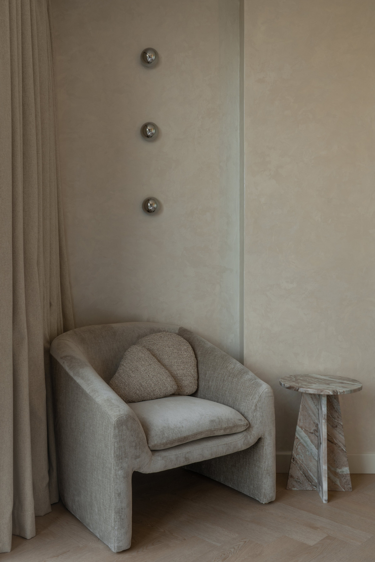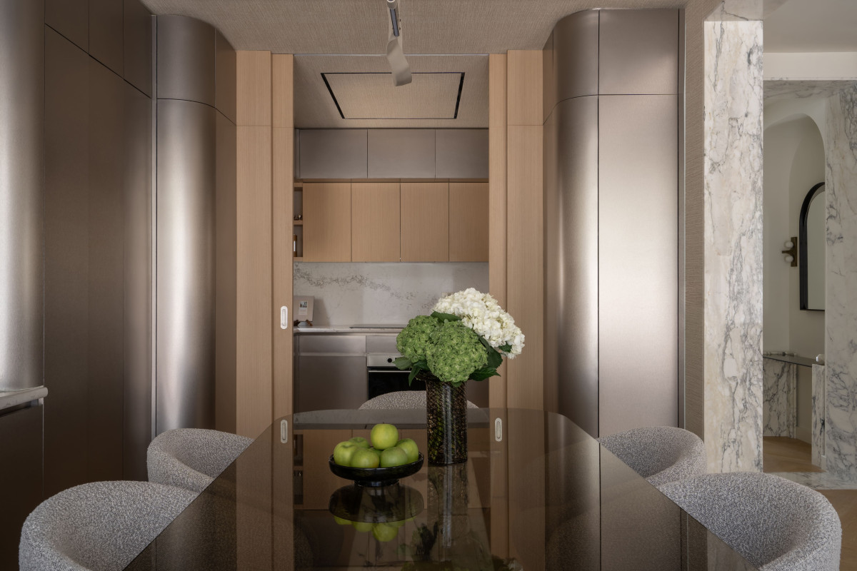 Dębowe podłogi w jodełkę zakotwiczają przestrzeń i nadają jej ciepłego, domowego charakteru. Marmur Calacatta Vagil, pojawiający się w oprawach architektonicznych, zabudowach, detalach i meblach, razem ze stalą, akcentami z niklu szczotkowanego i czarnego metalu, wprowadzają do wnętrz subtelne kontrasty. Wykończenia z mikrocementu, nadające wnętrzu industrialnego sznytu, pojawiają się w głównej sypialni, garderobach i toalecie gościnnej.