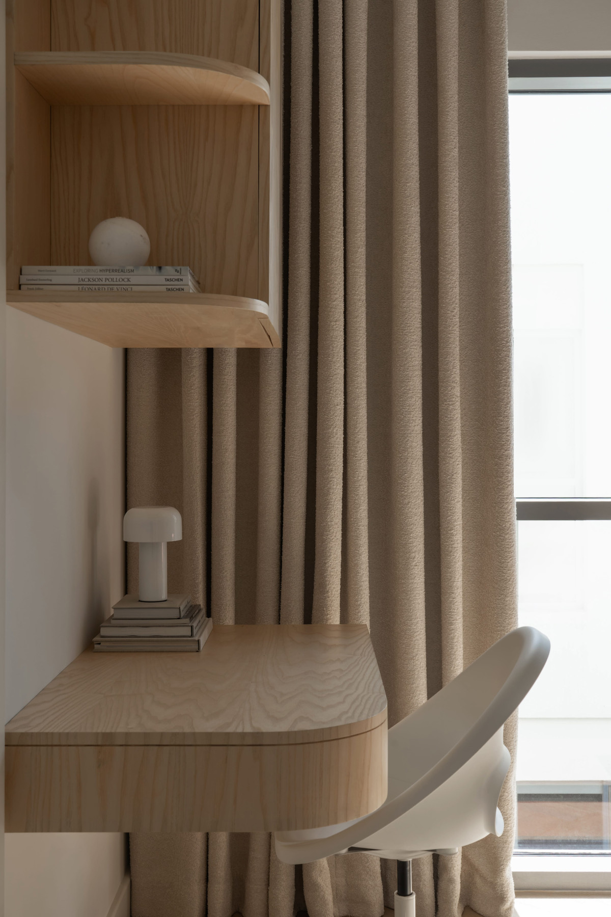 Biel w odcieniu off-white oraz dąb stanowią spokojną, ponadczasową bazę dla wnętrz. Kolor stosowany jest tu oszczędnie, lecz celowo. W głównej sypialni pojawiają się odcienie bakłażana i pudrowego różu, w pokoju córki – delikatne róże.