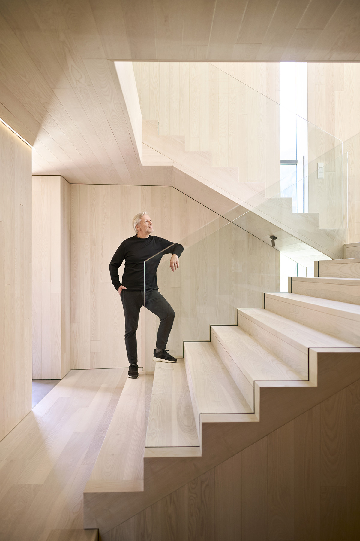 Wnętrza w całości wykończono olejowanym jesionem. Dom nie ma wentylacji mechanicznej ani klimatyzacji i jest w zasadzie samowystarczalny energetycznie. Rozwiązania proekologiczne pomógł opracować Thomas Auer z biura Transsolar. – W budynkach drewnianych chłodzenie bywa wyzwaniem. Zastosowaliśmy system oparty na tzw. efekcie kominowym. Powietrze pobierane jest z najchłodniejszych miejsc na poziomie garażu, następnie grawitacyjnie rozchodzi się po pomieszczeniach i uchodzi przez tzw. komin solarny z automatycznie otwieranymi klapami w dachu – tłumaczy Kuczia.