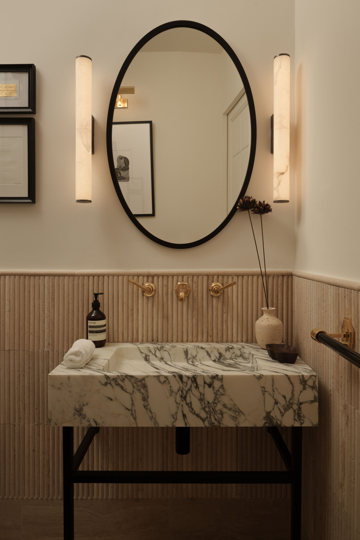Starannie dobrane do tego wnętrza materiały podkreślają jego paryską tożsamość. Ściany w łazienkach i stoliki kawowe wykonano z eleganckiego trawertynu. W sypialni pojawia się rattan. Ciemne drewno dodaje przestrzeni głębi, stabilności i ponadczasowego stylu, a także świetnie ociepla mieszkanie. Tapicerka to przede wszystkim szenil, aksamit i bouclé, które dodają połysku i miękkości.