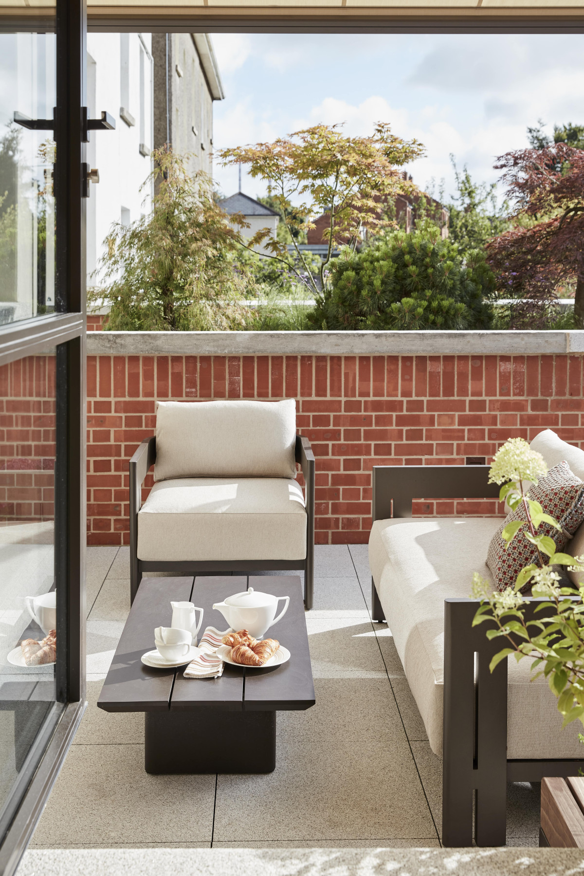 Architekci wykorzystali w projekcie kombinację różnych typów okien, które zapewniły stały dostęp do naturalnego światła, m.in.: duże przesuwne okno od strony ogrodu, wykusz od frontu oraz wysokie okna podstropowe. Ponieważ właścicielom zależało na połączeniu ogrodu ze strefą dzienną na wyższej kondygnacji, zespół LyonsKelly stworzył taras, do którego prowadzą granitowe schody.