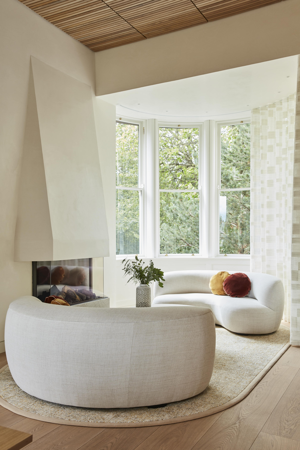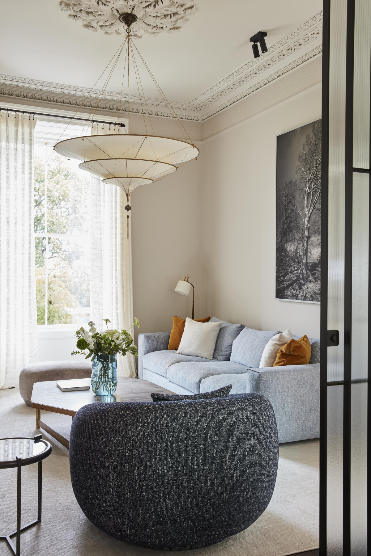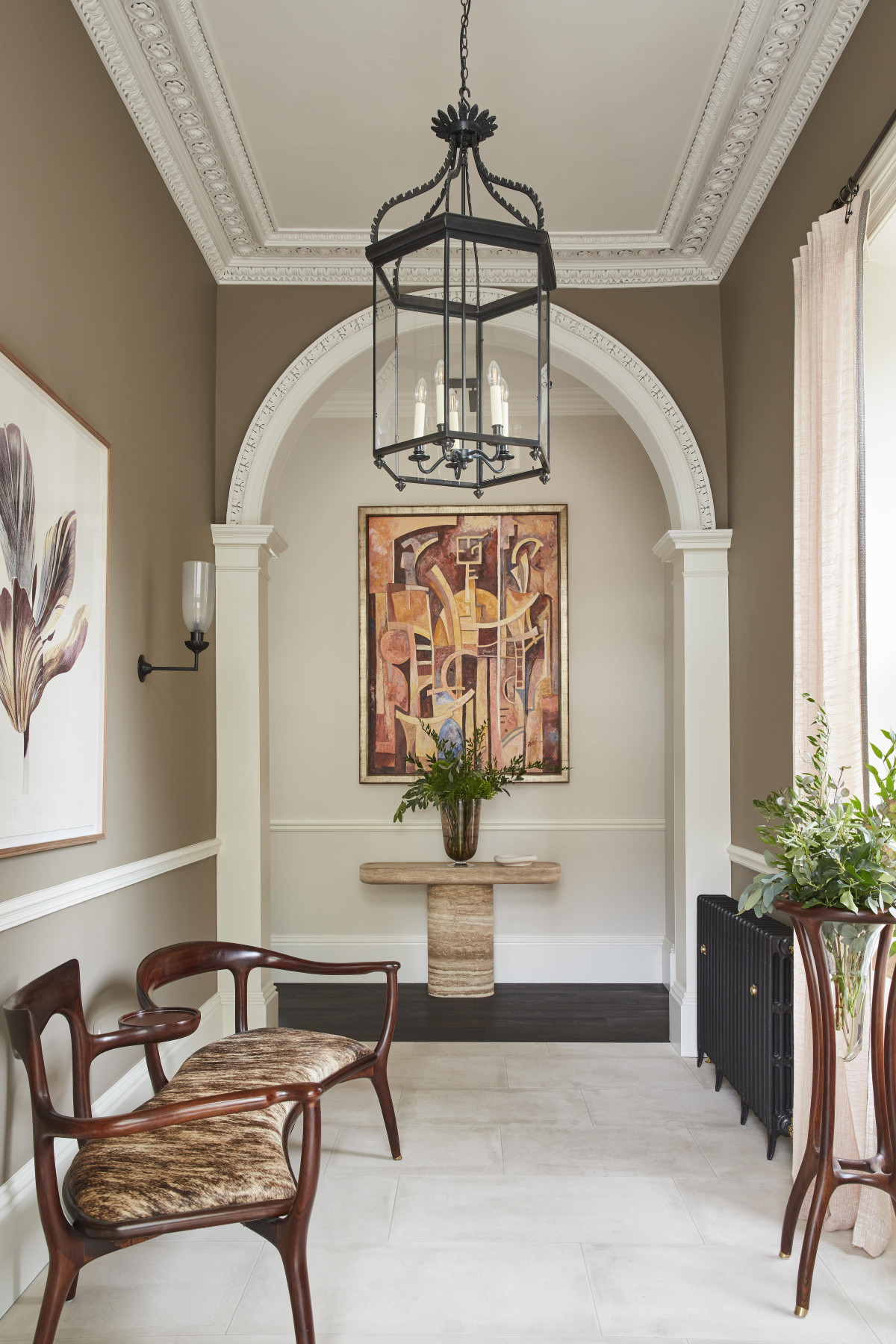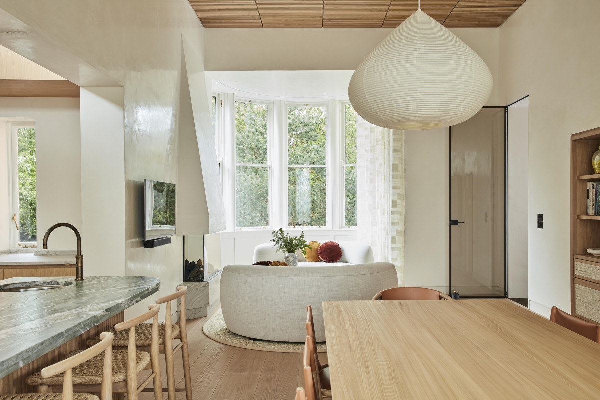 Styl wnętrz łączy współczesne rozwiązania z zabytkowymi wiktoriańskimi elementami jak sztukaterie i dekoracyjne kominki. Dom utrzymany jest w neutralnej, ale ciepłej kolorystyce, która pozwala grać pierwsze skrzypce barwnym dziełom sztuki, nowoczesnym meblom o obłych kształtach i miękkich obiciach, oraz stylowym dodatkom, które dopełniają aranżację.