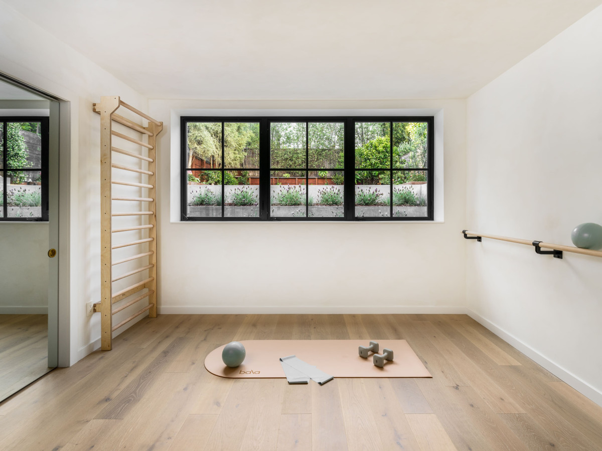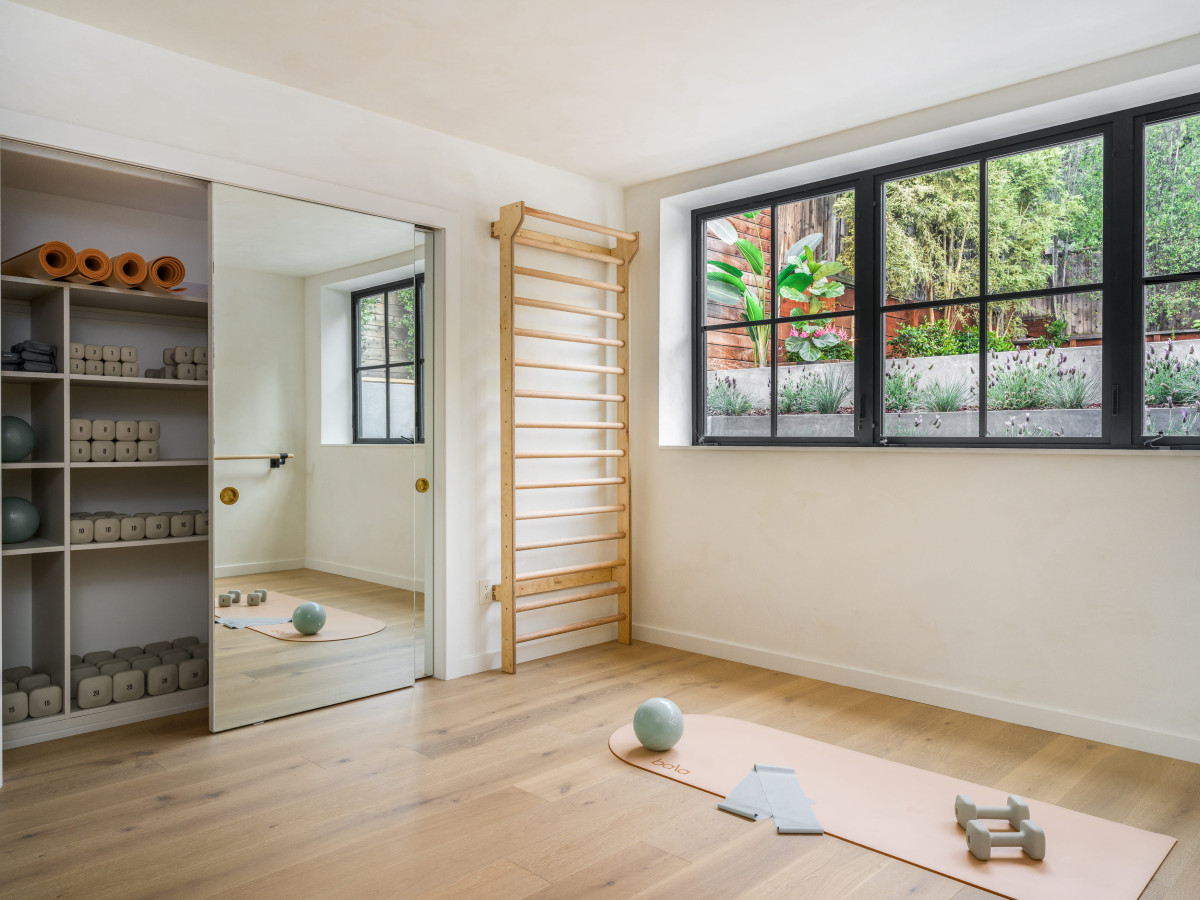Jednym z najbardziej wymagających pomieszczeń do urządzenia było studio fitness na najniższym poziomie domu. Studio powstało pod dawnym tarasem ogrodowym, a część płyty garażowej została obniżona, by uzyskać komfortową wysokość pomieszczeń. Choć studio fitness znajduje się ponad 1.5 m pod parterem, dzięki przemyślanemu ukształtowaniu ogrodu, możliwe było zastosowanie dużych przeszkleń, które z jednej strony wypełniły pomieszczenie naturalnym światłem, a z drugiej – zapewniły poczucie kontaktu z ogrodem.