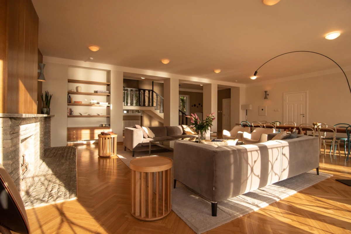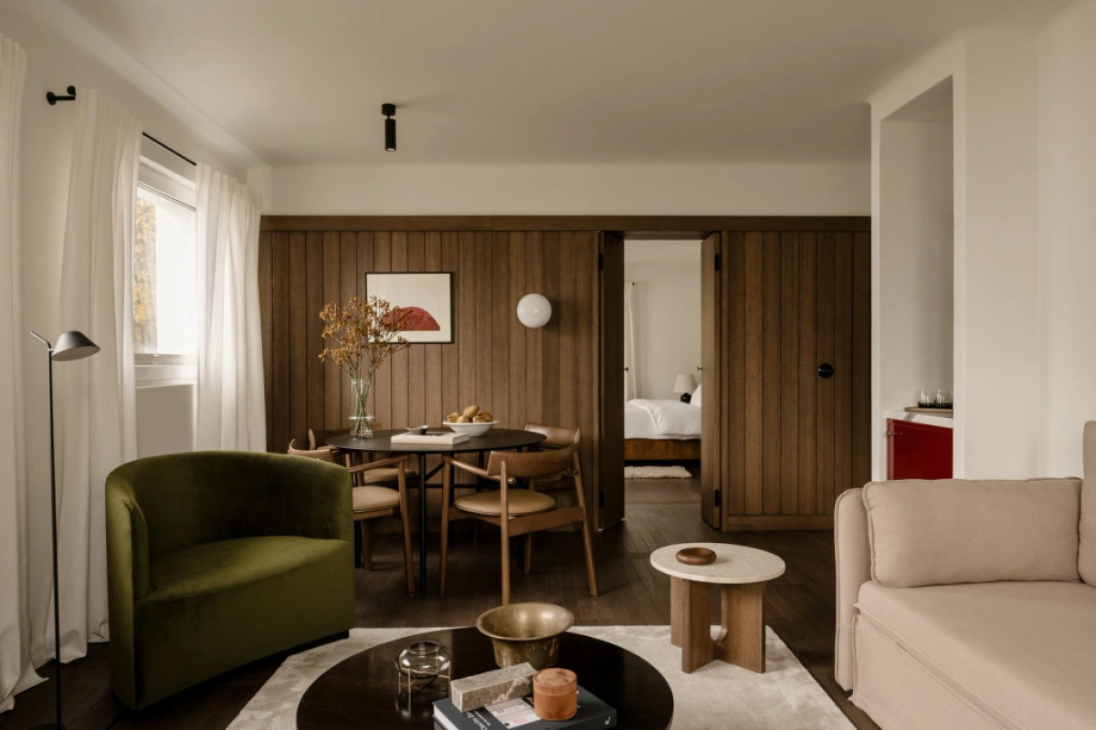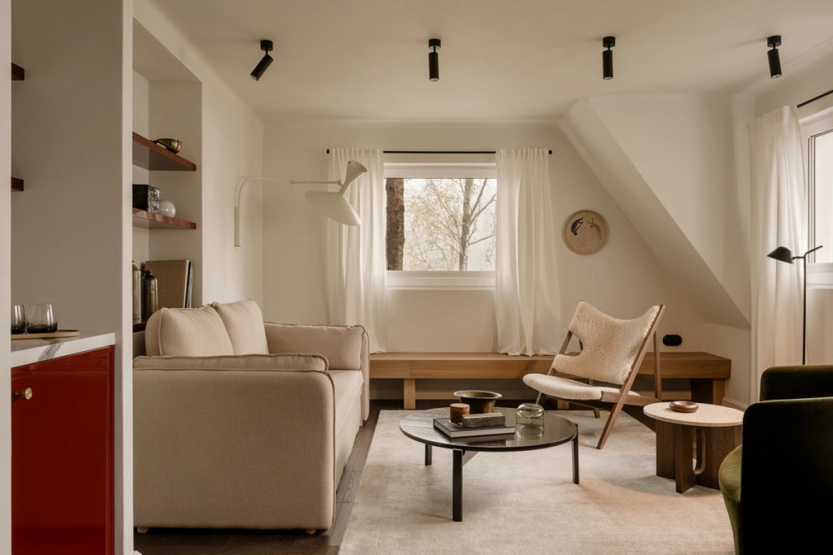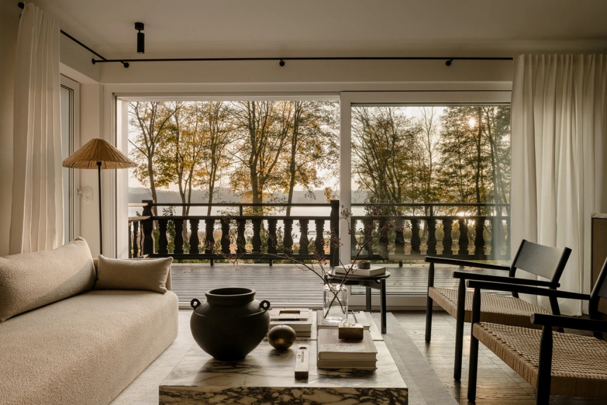 Renowację ośrodka i udostępnianie przestrzeni gościom gospodarze rozpoczęli od Willi Orlik. To dom stworzony z myślą o grupach (choć możliwy jest także wynajem pokoju) – sprzyjający organizacji konferencji, integracji czy rodzinnych uroczystości. Skłania do tego przestrzeń salonu, wyposażonego w bardzo długi stół. To także idealne miejsce na butikowe wesela w duchu slow, bo na terenie ośrodka znajduje się 100-metrowa sala z widokiem na jezioro. Wspólny czas w Orliku można spędzać przy kominku, a obita drewnianą boazerią ściana wokół niego przywołuje skojarzenia z estetyką wnętrz mid-century modern. Odnawiając budynek Orlika, właściciele starali się zachować jego atmosferę i wzornictwo pomieszczeń zaprojektowanych w drugiej połowie ubiegłego wieku. Postawili na wysokiej jakości meble i dodatki. Znajdują się wśród nich legendarne projekty Romana Modzelewskiego, le Corbusiera czy Antoniego Citteria. Do mebli głównie skandynawskich i hiszpańskich marek dobrali swoje ulubione plakaty i kilimy.