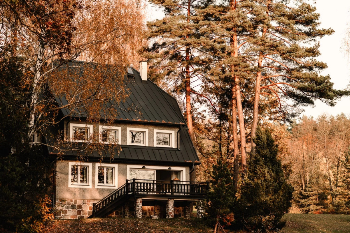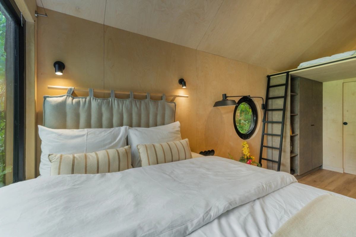 Na terenie ośrodka znajduje się również trzecia willa, będąca właśnie w trakcie modernizacji. Biorąc pod uwagę poziom dopracowania poprzednich dwóch projektów, nie sposób nie zastanawiać się, jaki pomysł gospodarze będą mieli na jej wnętrza. Jednak, co ciekawe, apartamenty w zabytkowych budynkach ośrodka nie są jedynymi przestrzeniami, gdzie na terenie Łęguckiego Młyna mogą odpoczywać goście. Ci, którzy potrzebują większej prywatności lub chcą być bliżej przyrody na terenie posiadłości, mogą wynająć kompaktowy domek UKOI z widokiem na jezioro. Choć ma tylko 17 m, zapewnia komfortowe i niezależne warunki do relaksu na malowniczym terytorium posiadłości.