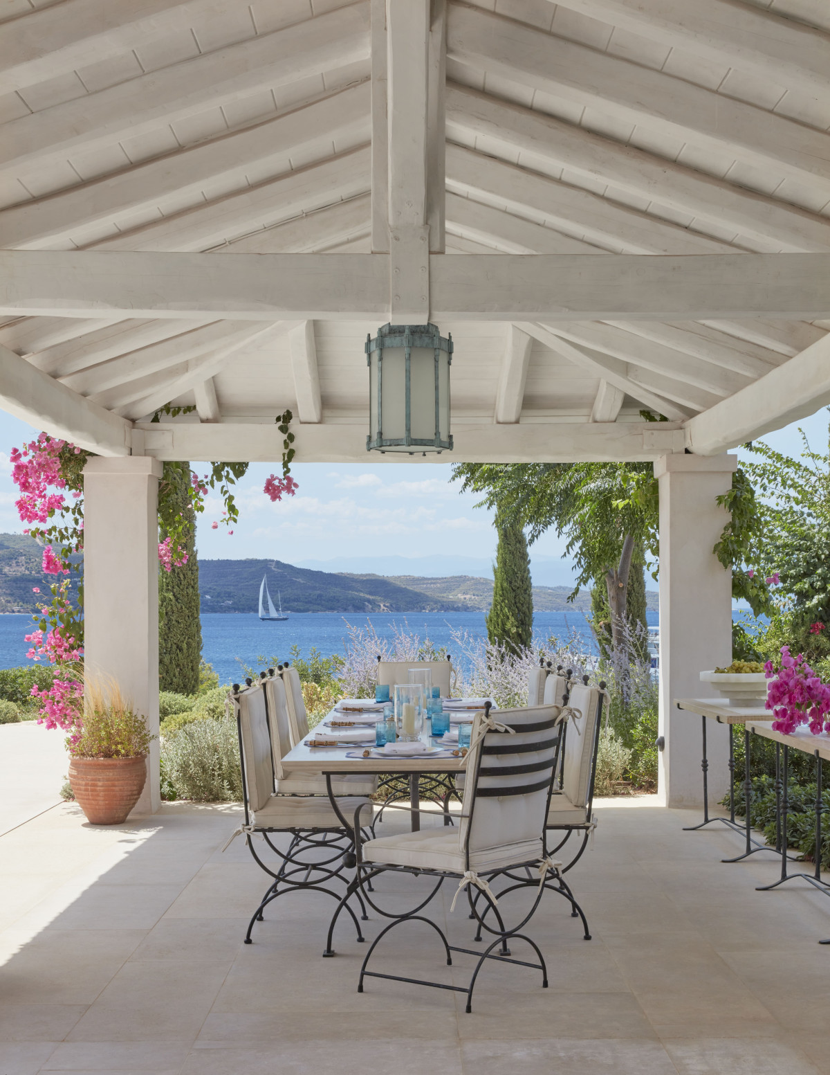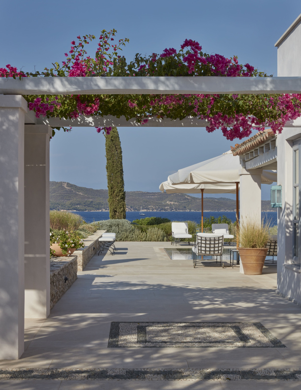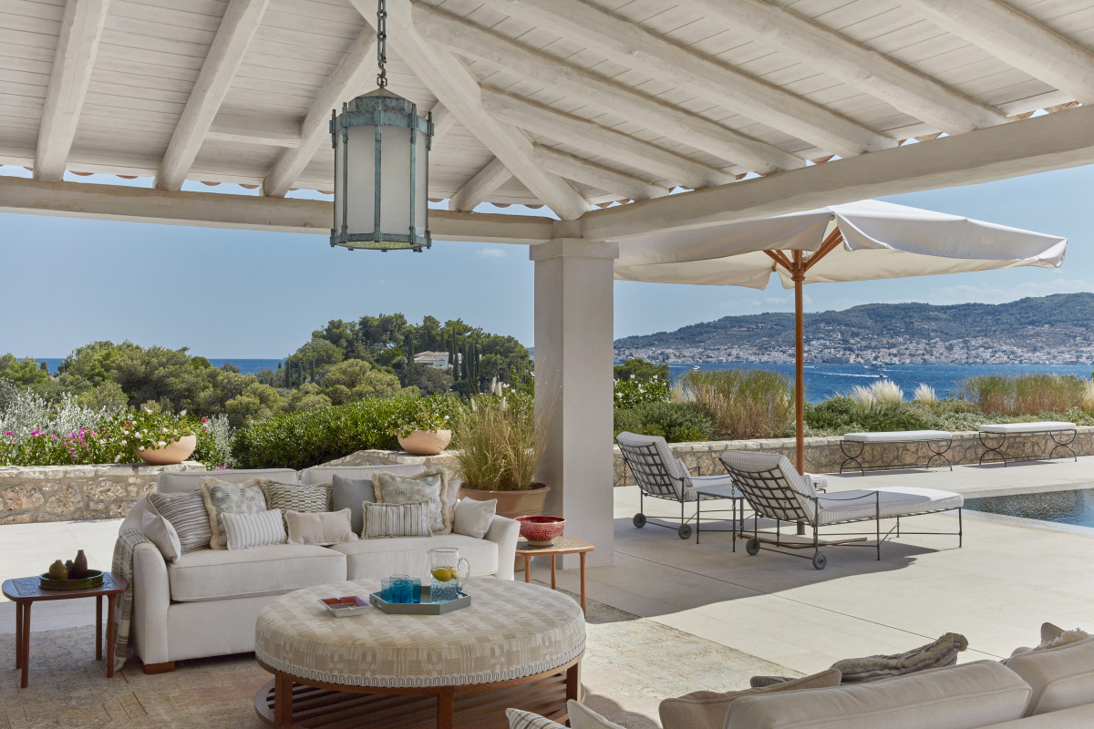 Dom znajduje się na rozległej działce w pobliżu Porto Cheli na Peloponezie. Z okien rozpościera się widok na morze i pobliską wyspę Spetses. Właściciele, którzy dzielą czas między USA a Europą, marzyli o letniej rezydencji, w której mogliby odpocząć i spędzić czas w gronie rodziny i przyjaciół.