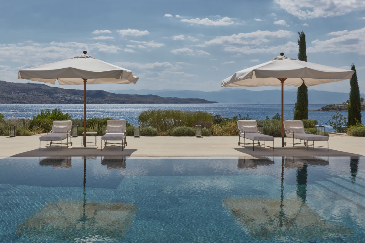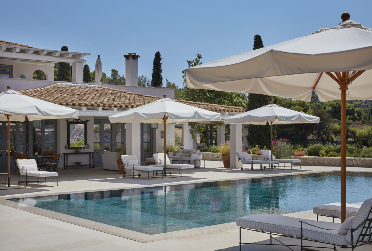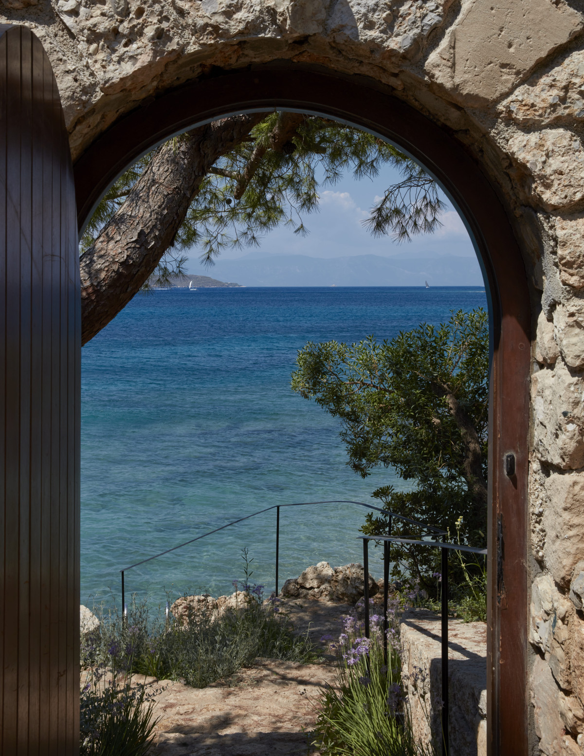 Dom znajduje się na rozległej działce w pobliżu Porto Cheli na Peloponezie. Z okien rozpościera się widok na morze i pobliską wyspę Spetses. Właściciele, którzy dzielą czas między USA a Europą, marzyli o letniej rezydencji, w której mogliby odpocząć i spędzić czas w gronie rodziny i przyjaciół.