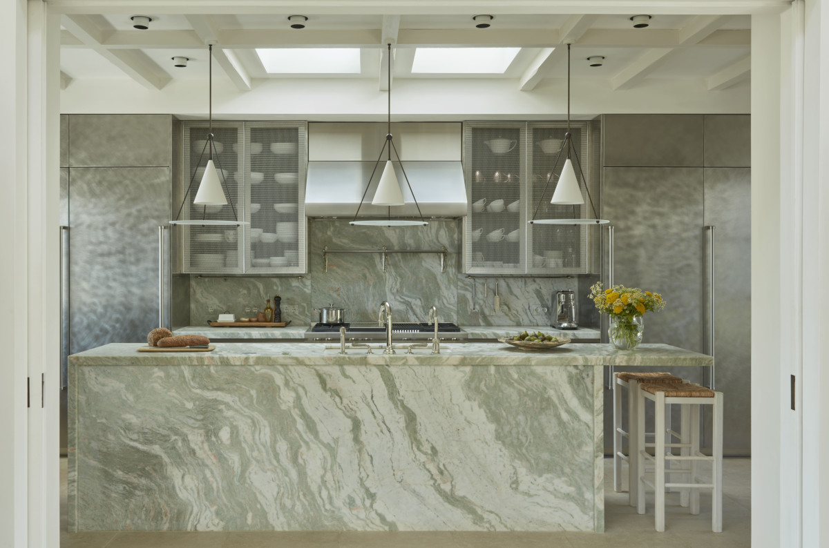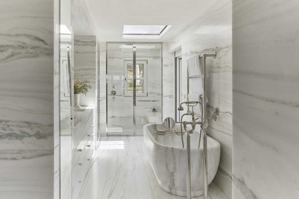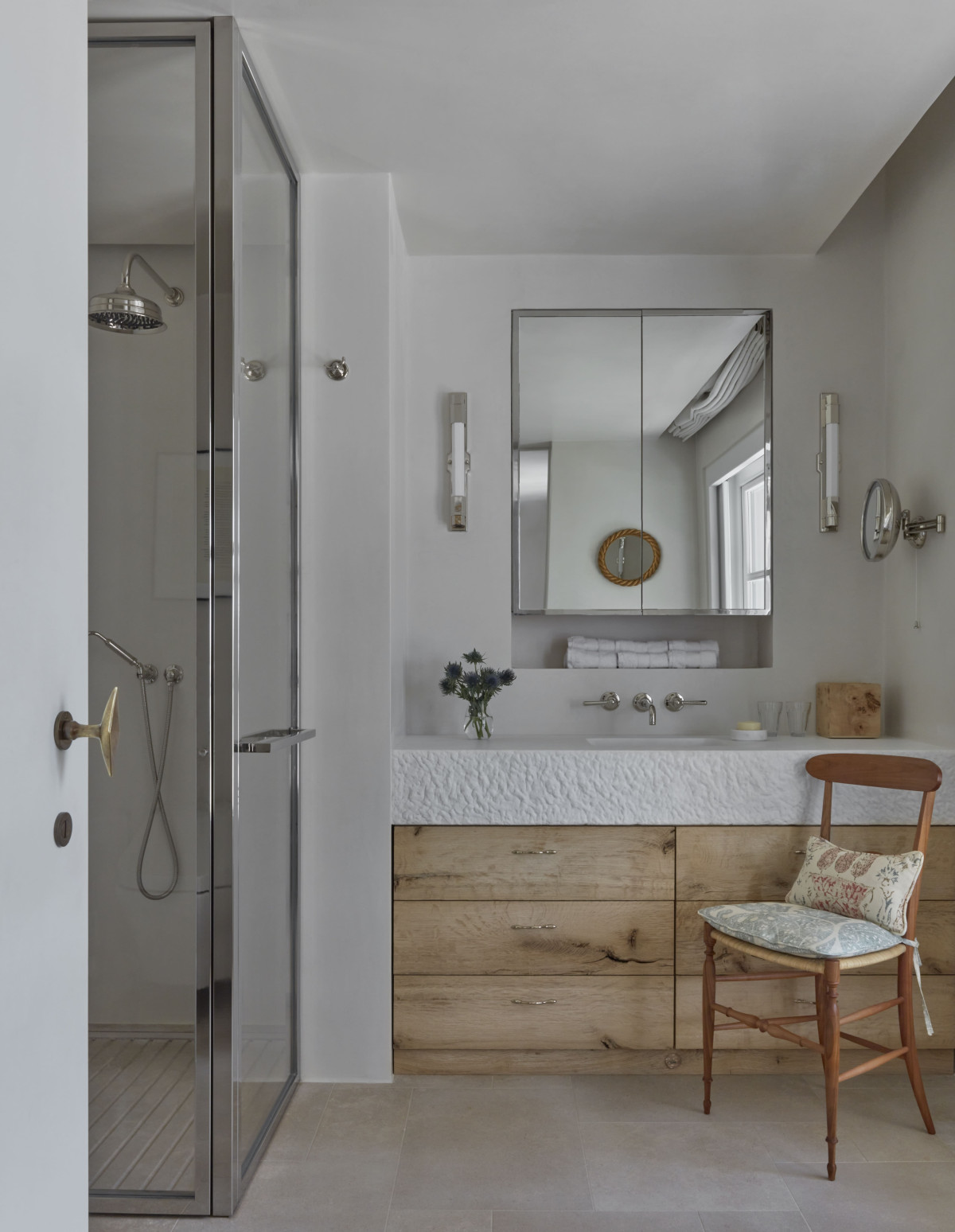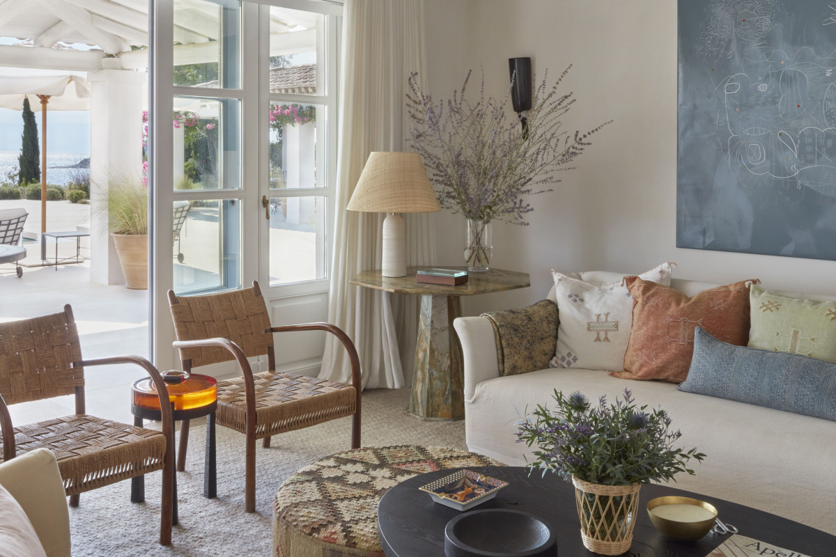 Projekt oparto na uproszczonych, rustykalnych przestrzeniach zakorzenionych w lokalnym rzemiośle i materiałach. Wnętrza wykończono farbami mineralnymi, natomiast elewację i stolarkę zewnętrzną delikatnie pobielono na wzór lokalnej architektury. Grecki marmur odgrywa kluczową rolę w tym projekcie – wykorzystano go m.in. w rzeźbiarskiej wannie wykutej z marmuru Dionysos, wyspie kuchennej z marmuru Alba Chiara czy basenie wyłożonym marmurem Verde Tinos. Meble oraz dodatki to z kolei mieszanka stylu vintage i współczesnego designu, podkreślająca swobodną i elegancką estetykę nadmorskiej rezydencji.
