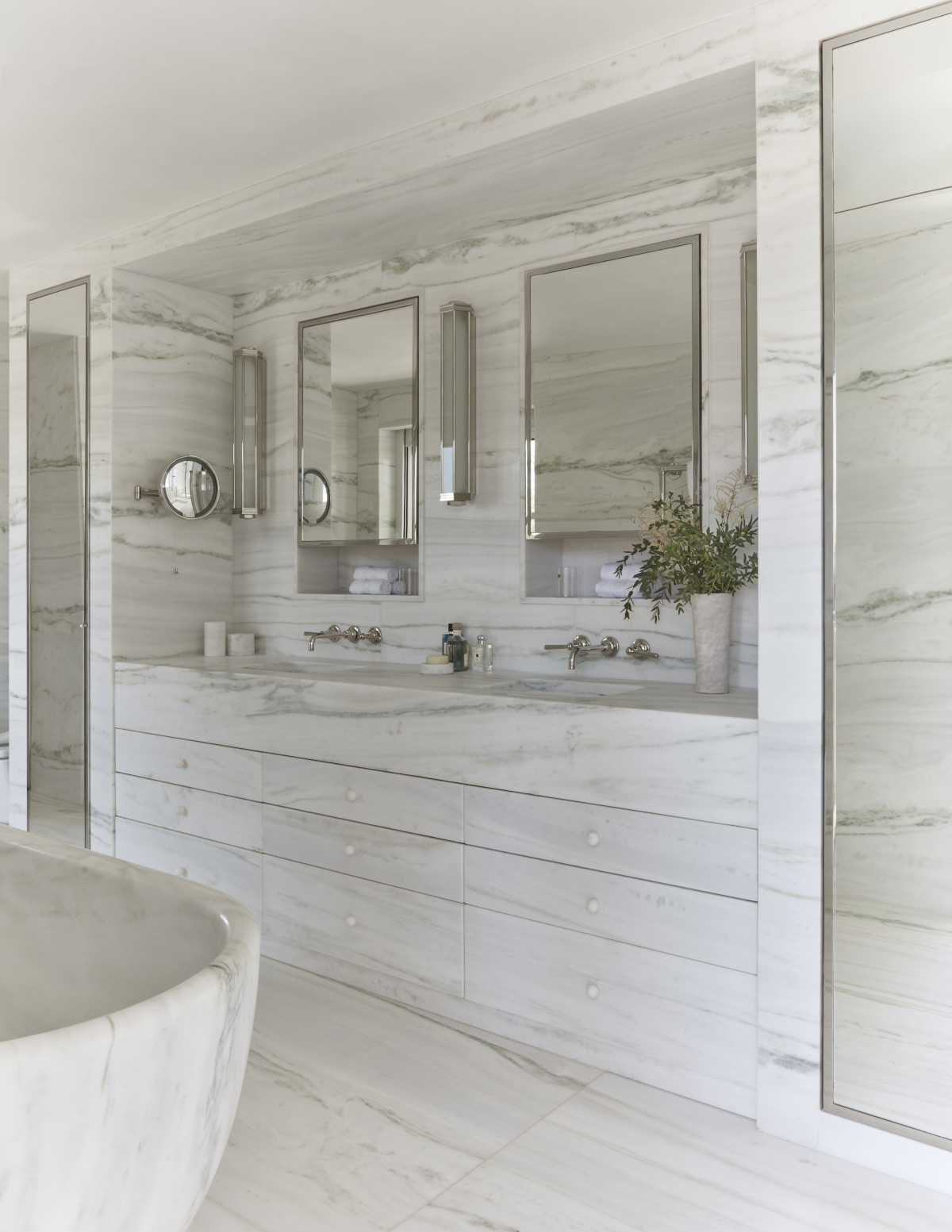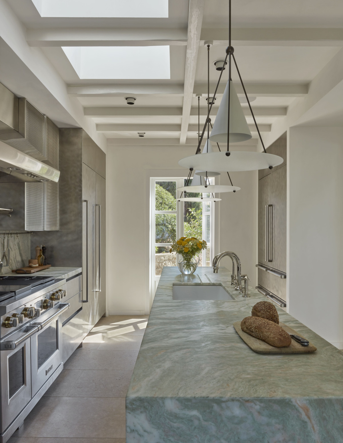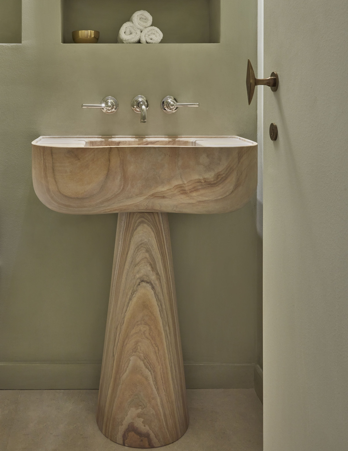 Projekt oparto na uproszczonych, rustykalnych przestrzeniach zakorzenionych w lokalnym rzemiośle i materiałach. Wnętrza wykończono farbami mineralnymi, natomiast elewację i stolarkę zewnętrzną delikatnie pobielono na wzór lokalnej architektury. Grecki marmur odgrywa kluczową rolę w tym projekcie – wykorzystano go m.in. w rzeźbiarskiej wannie wykutej z marmuru Dionysos, wyspie kuchennej z marmuru Alba Chiara czy basenie wyłożonym marmurem Verde Tinos. Meble oraz dodatki to z kolei mieszanka stylu vintage i współczesnego designu, podkreślająca swobodną i elegancką estetykę nadmorskiej rezydencji.