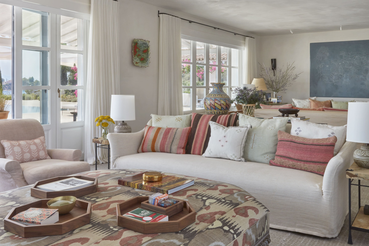 Sercem domu jest przestronny salon, który architekt podzielił na dwie swobodne strefy wypoczynkowe i otworzył na zadaszony taras sprzyjający długim rozmowom. Posiłki można spożywać zarówno wewnątrz, jak i na zewnątrz, pod licznymi pergolami (jedna została zaprojektowana z myślą o stole na czterdzieści osób!).