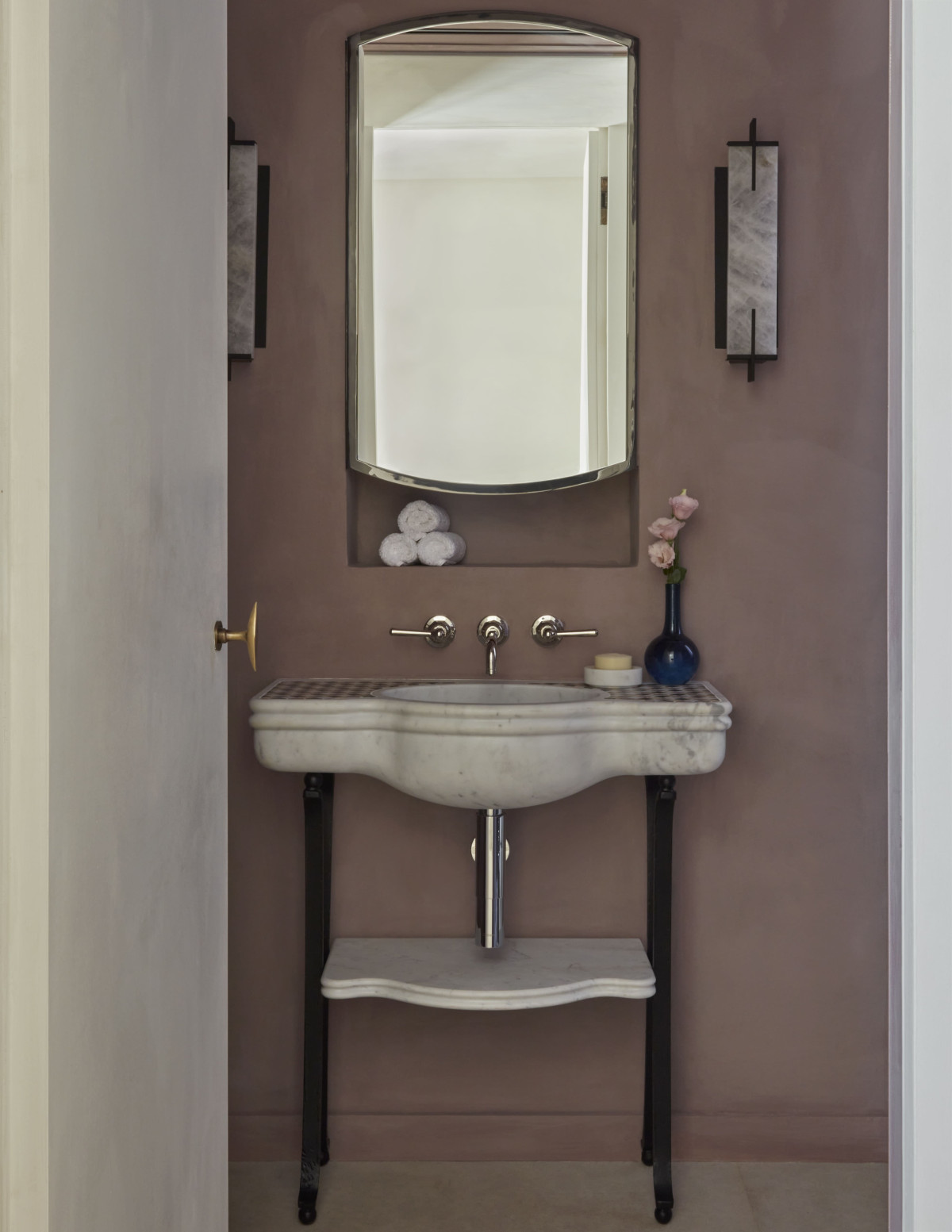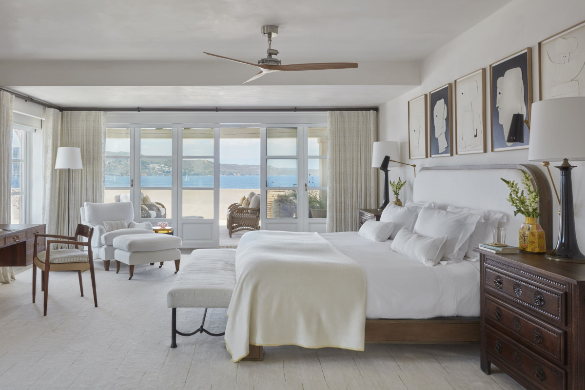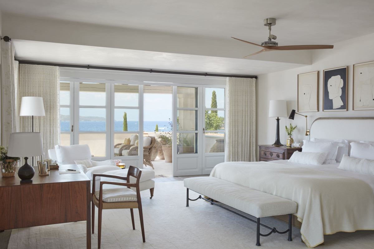Apartament główny należący do właścicieli zajmuje górny poziom posiadłości i stanowi zaciszną enklawę z prywatnym tarasem, urządzoną w neutralnej kolorystyce i ożywioną akcentami żółci. Do dyspozycji domowników i gości jest też basen oraz podziemna sala kinowa otulona miękkimi, czerwonymi tkaninami.