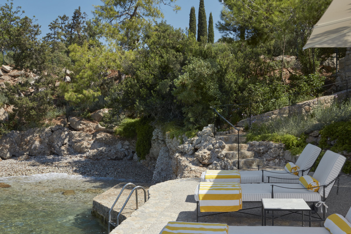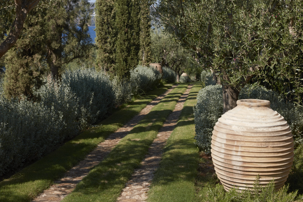 Przestrzeń wokół domu to dzieło architekta krajobrazu, Tommaso del Buono. Posadzki z kamiennej mozaiki, liczne murki i pergole pomagają kadrować widoki na wodę. Prywatny pomost prowadzi bezpośrednio do morza, przy czym łukowe przejście w kamiennym murze tworzy poetycką ścieżkę a plażę.