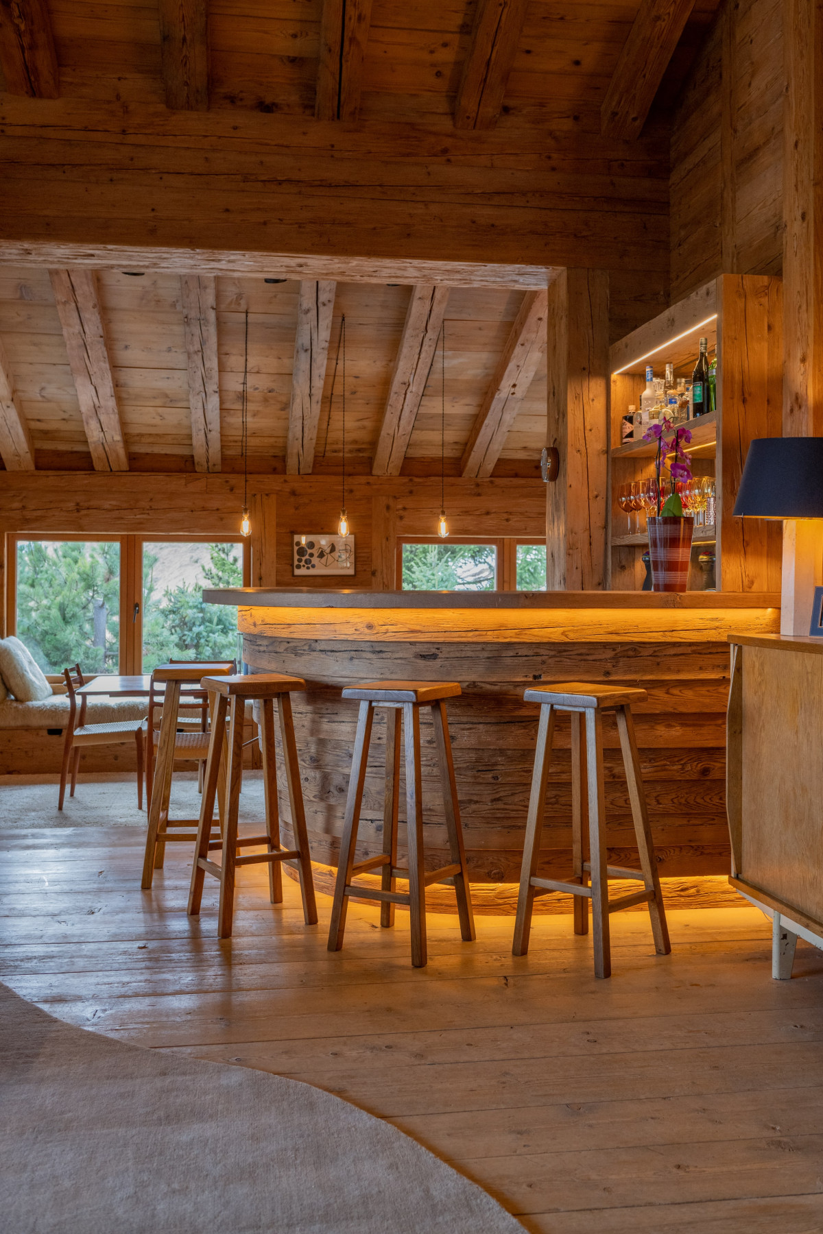 W zależność od pory roku za oknami widać śnieg lub zieleń, a we wnętrzu można cieszyć się wygodami, korzystając z przestronnego salonu, baru z hockerami, a przede wszystkim ze strefy wellness z hammamem, sauną i jacuzzi. W willi znajduje się sześć sypialni i sześć łazienek.