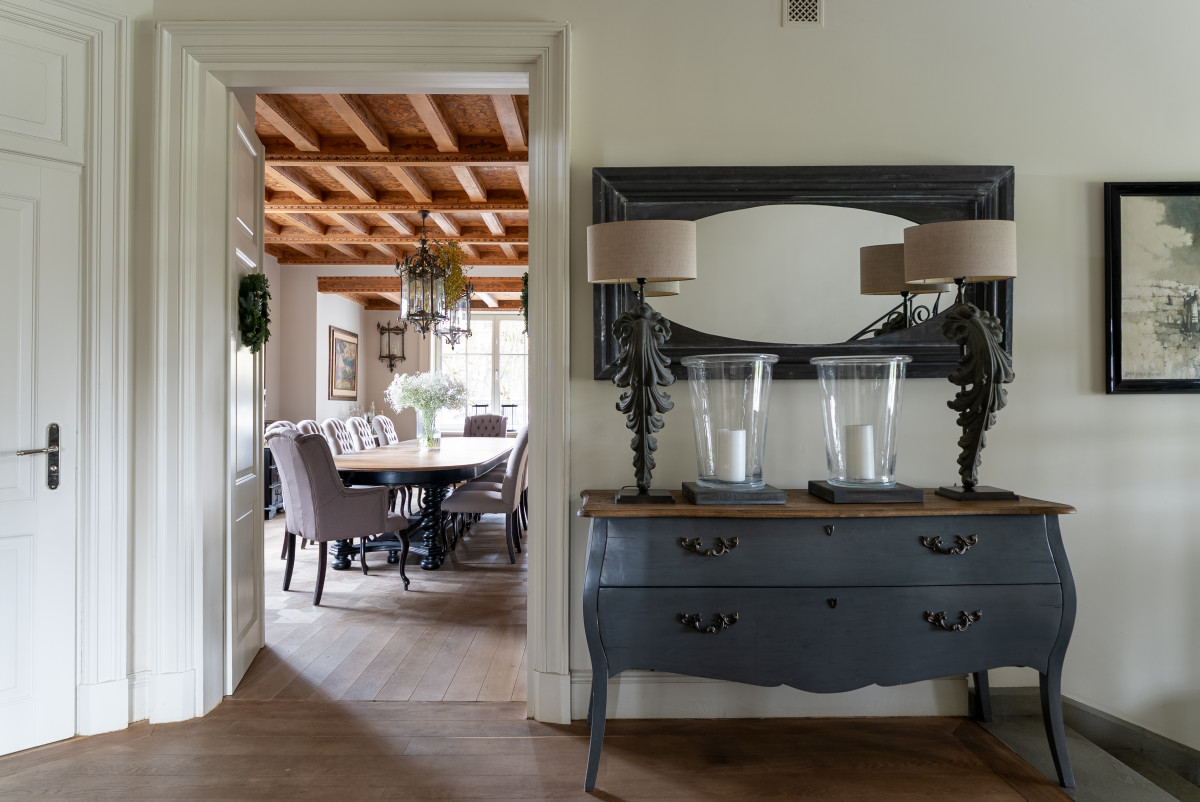 W willi nie mogło też zabraknąć reprezentacyjnej jadalni, która świetnie sprawdza się podczas formalnych i uroczystych okazji, i która może pomieścić nawet 20 osób. W pomieszczeniu wzrok przykuwa szczególnie dekoracyjny, ręcznie malowany strop z widocznym belkowaniem.