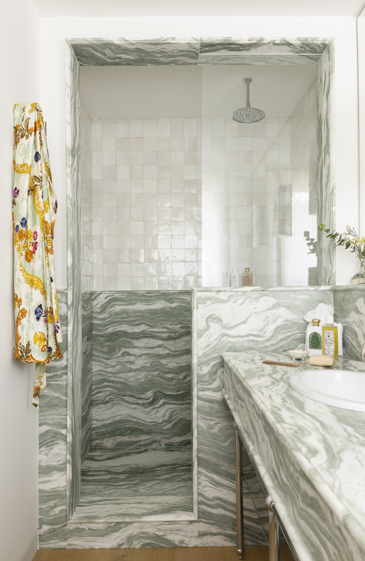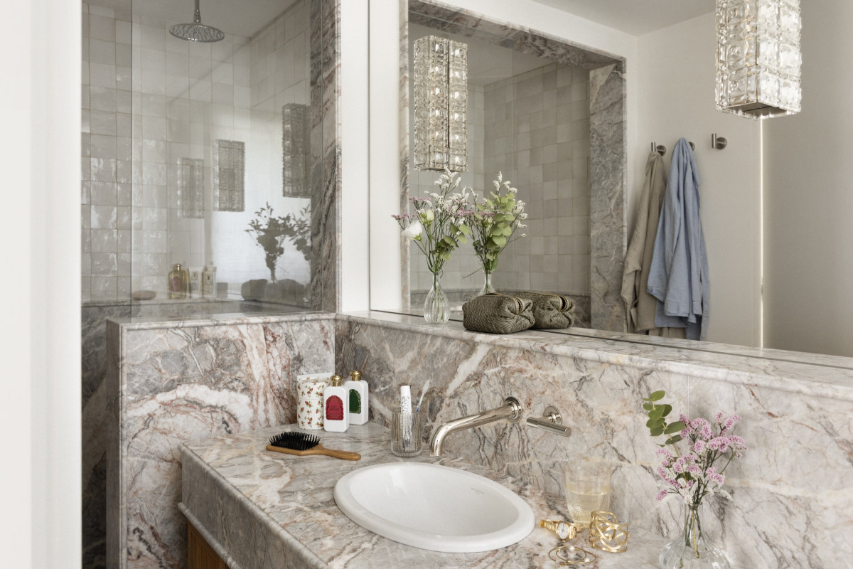 Wszystkie kominki, umywalki i elementy marmurowe zostały wykonane na zamówienie. I tak w sypialni numer 1 i 2 wykorzystano szaro-różowy marmur „Fior di Pesco” (Udine), w kominku salonowym użyto marmuru Diaspro z Sycylii, w toalecie dla gości Onice Multicolor z Brazylii, w głównej kuchni marmur Ombra di Caravaggio sprowadzony z Serbii, w łazience numer 3 Albachiara Verde z północnych Włoch, a do łazienki nr 4 marmur Calacatta Viola Lilla.