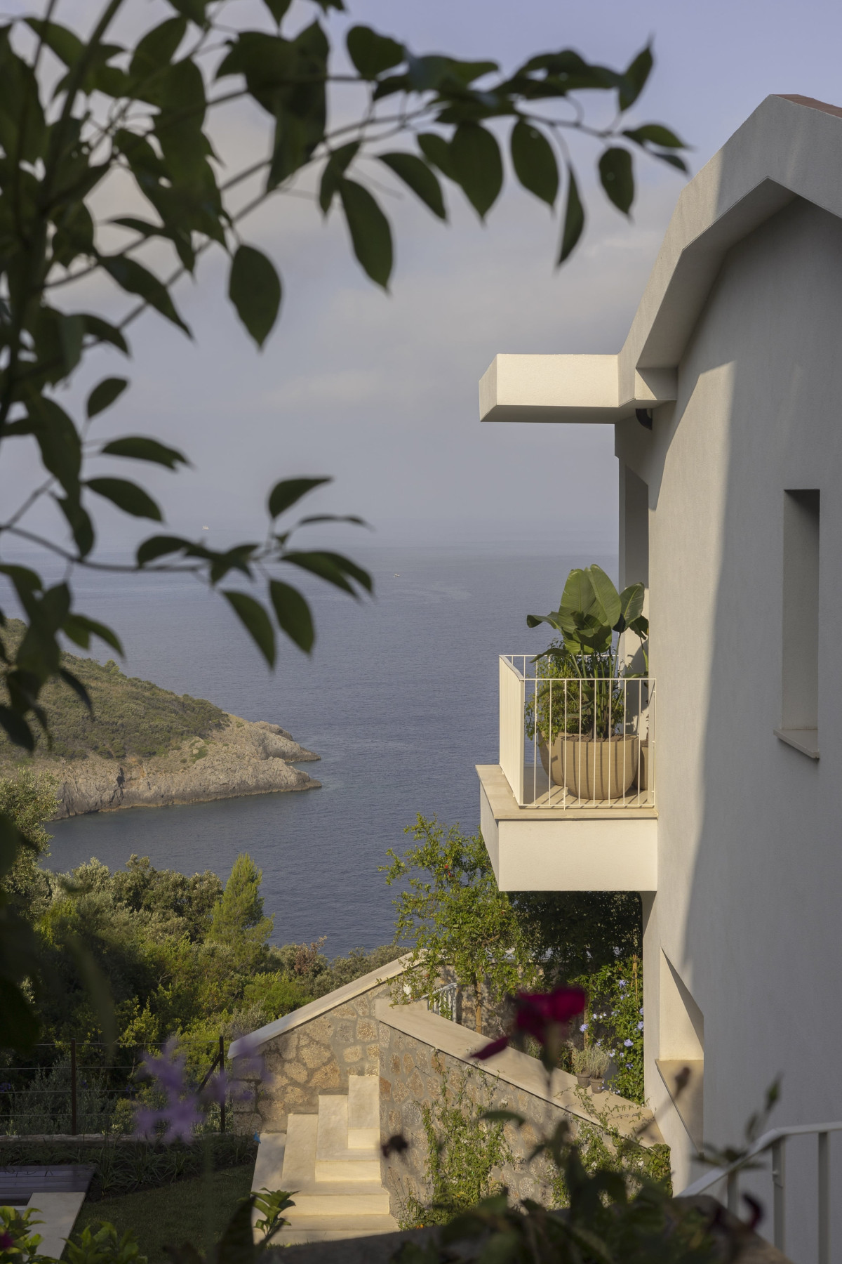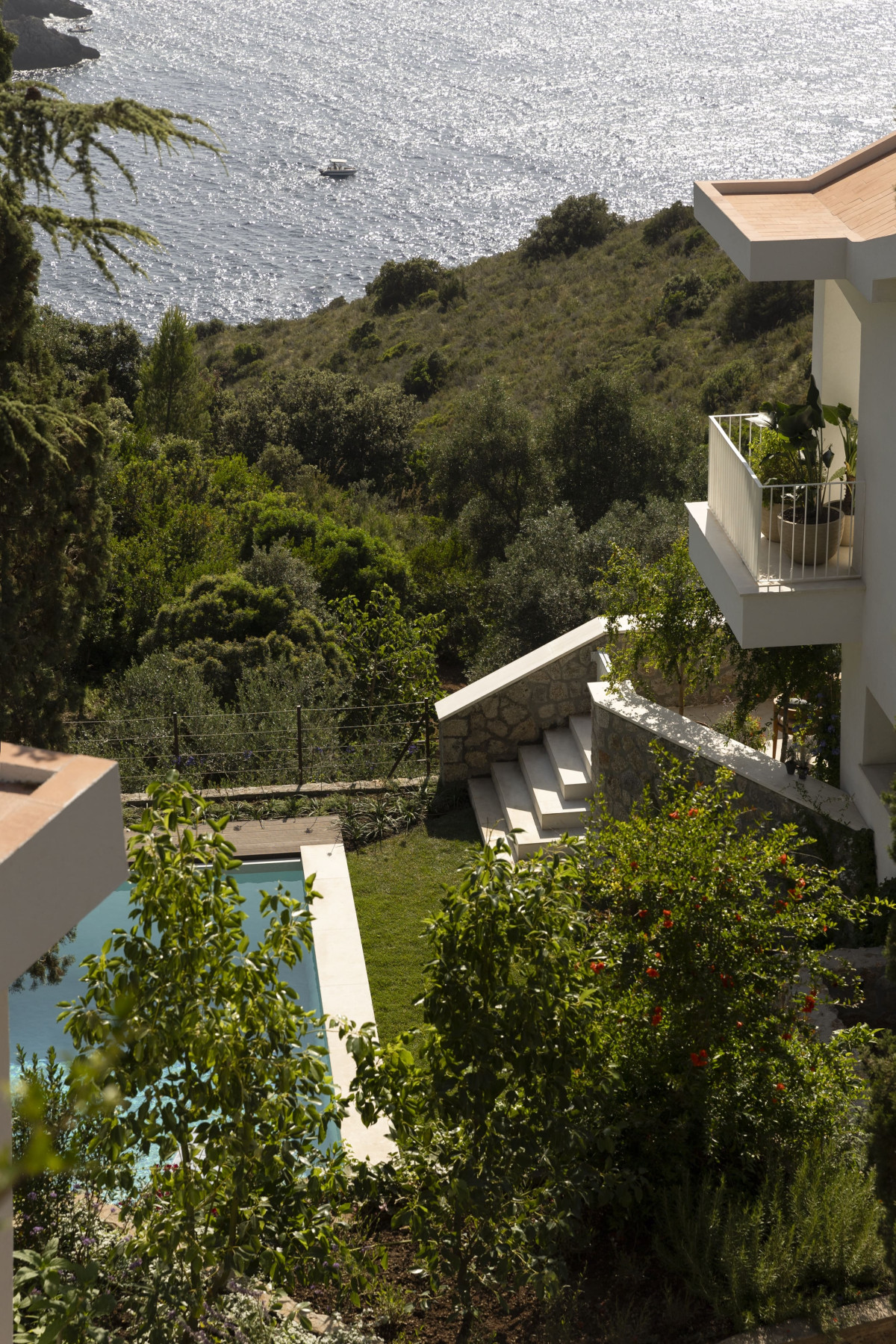 Dom został wkomponowany w zbocze wzgórza. Przestrzeń mieszkalna zajmuje trzy poziomy: na parterze znajdują się 2 sypialnie, 2 łazienki, kuchnia i salon, a także pralnia i prywatny ogród z widokiem na morze. Na piętrze 5 sypialni typu suite, 1 sypialnia z łóżkiem piętrowym i 5 łazienek. Poziom dolny to przestrzeń z kuchnią, spiżarnią, barem, toaletą gościnną, jadalnią, drugim salonem, wyjściem na basen i taras.