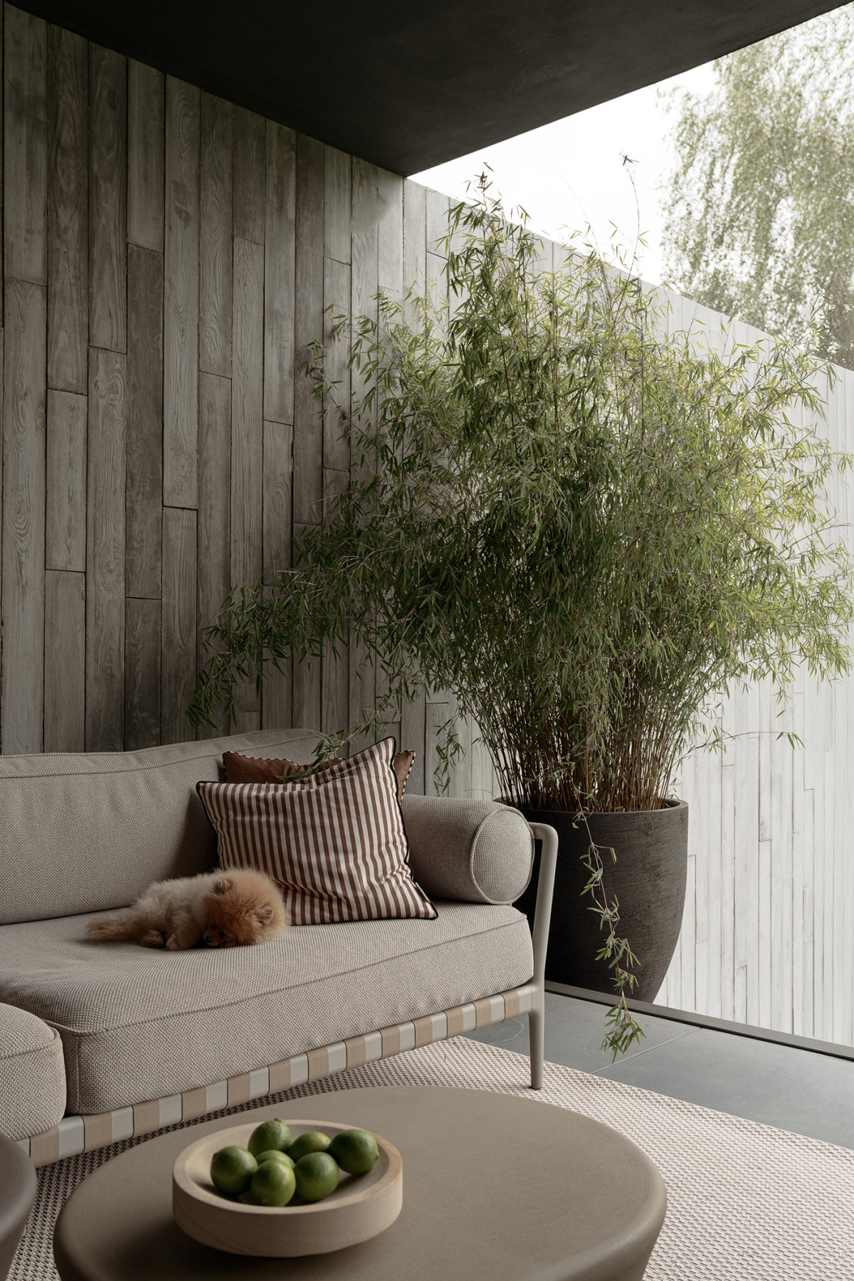 Leonardo, jeden z dwóch szpiców właścicieli, na ogrodowej kanapie marki Vipp. Obok stolik „Fun–Go” z Kristalii, a na nim kamienna misa z Zara Home. Dzięki dużym, rozsuwanym narożnikowo przeszkleniom przestrzeń salonu można łatwo powiększyć o zewnętrzny taras. Zdjęcie: Tom Kurek