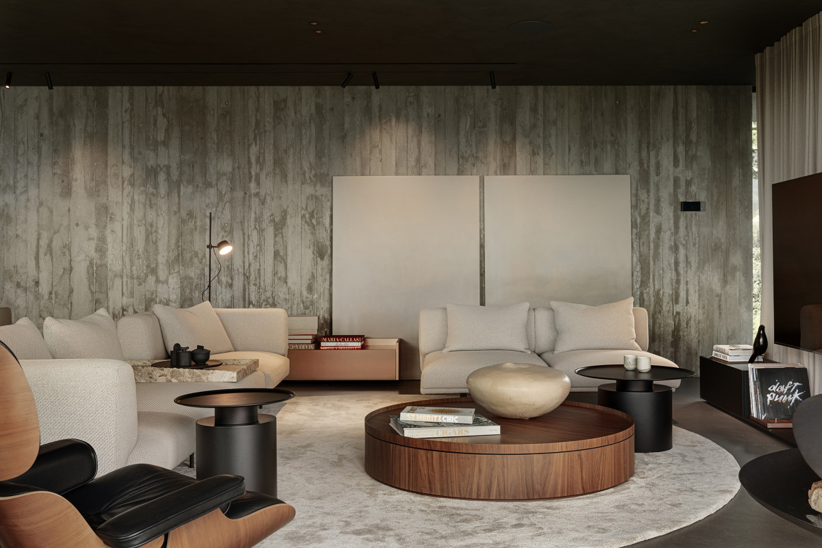 Budynek to w zasadzie parterowy pawilon z rozbudowaną kondygnacją podziemną, gdzie oprócz garażu znalazły się sala kinowa, spa i ciemnia fotograficzna. Na dachu urządzono taras i ukryto część instalacji. Czarne fotele „Sam Son” to projekt Konstantina Grcica dla Magis, stolik „Fun–Go” dla marki Kristalia opracowało studio Finemateria. W projekt oprócz Bartłomieja Bajona i Katarzyny Cynki-Bajon od początku zaangażowany był Bartosz Stanek z PL.architekci. Zdjęcie: Tom Kurek