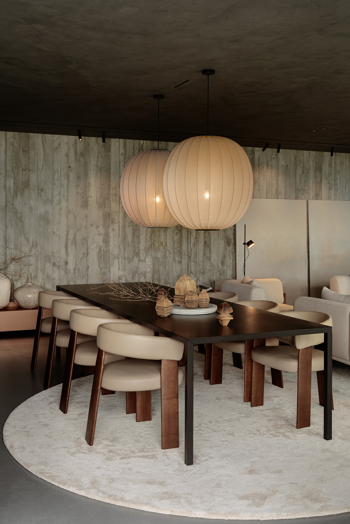 Centralna część salonu z modułową sofą „Chimney” marki Vipp. Na tle betonowej ściany z odciśniętym szalunkiem drewnianych desek wyeksponowano dyptyk „Leniwy dzień” młodej gdańskiej artystki Agnieszki Kirzanowskiej-Osińskiej. Niski, okrągły stolik i komoda z tyłu to autorskie projekty biura PL.architekci zrealizowane przez firmę Agmar. Czarny stolik pomocniczy „Pillar” dla 101 Copenhagen zaprojektowali Kristian Sofus Hansen i Tommy Hyldahl. Autorką ceramicznej wazy na pierwszym planie jest Katarzyna Poniecka. Zdjęcie: Tom Kurek