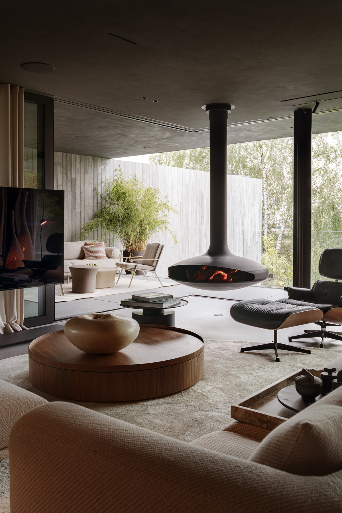 Główną rolę w strefie dziennej gra obrotowy kominek „Gyrofocus” Dominique’a Imberta i fotel z podnóżkiem Charlesa i Ray Eamesów. Zdjęcie: Tom Kurek