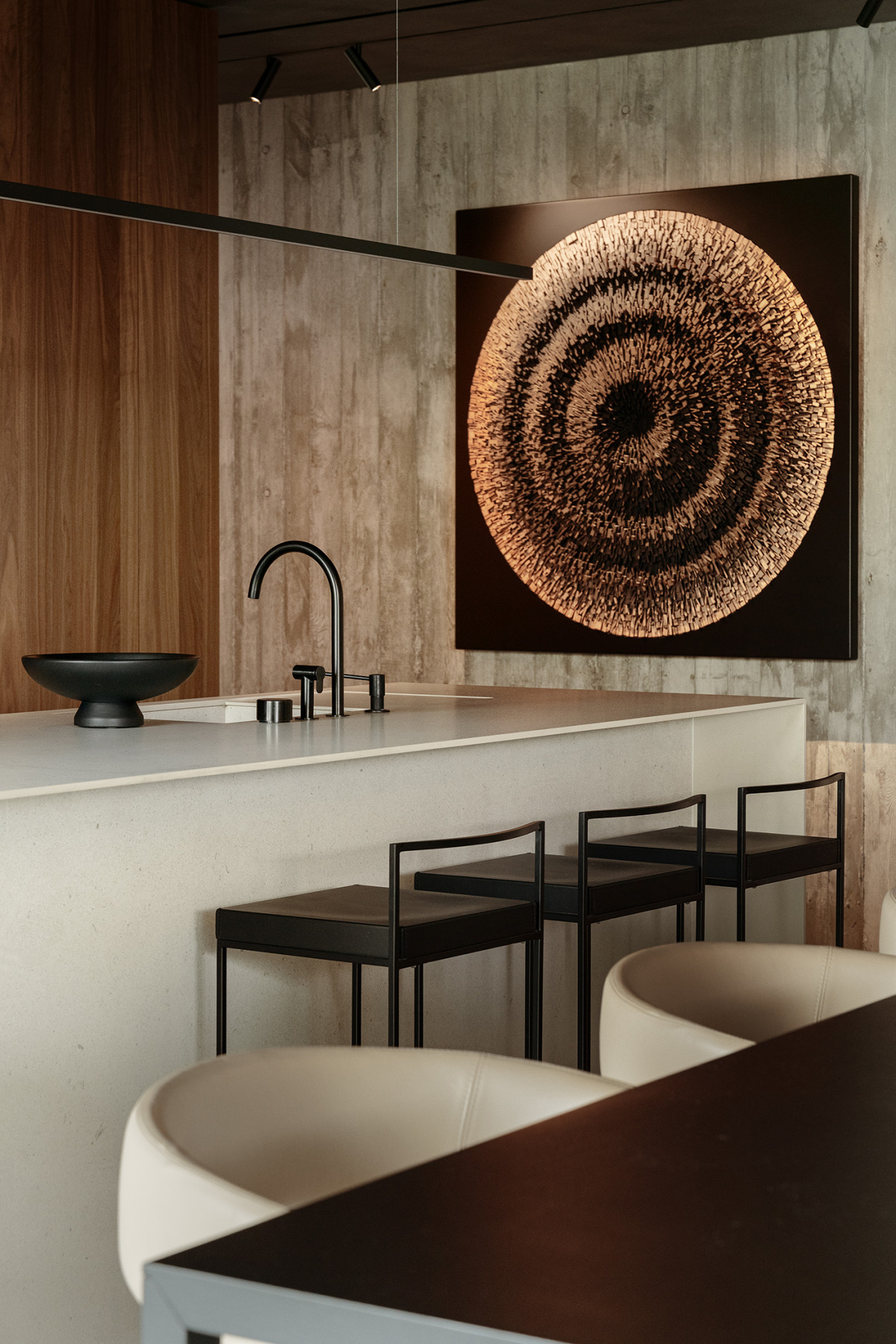 Wyspę kuchenną ze spieku Ascale zaprojektowali PL.architekci, a hokery „Cuba + Cubo” stworzył dla Lapalmy Enzo Berti. Na ścianie jedna z prac Andrzeja Sobiepana, „The form of disaster”. Zdjęcie: Tom Kurek