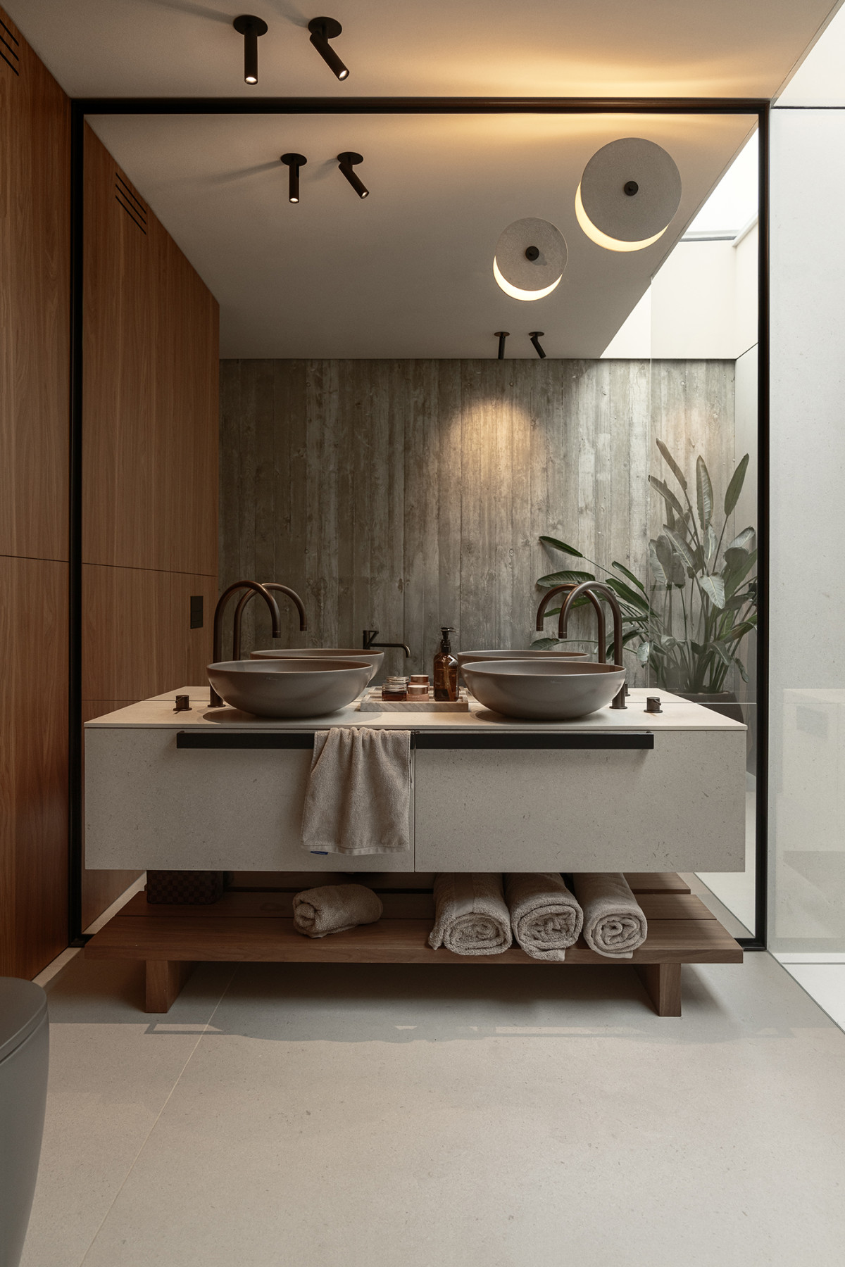 Fragment łazienki z autorską szafką ze spieku Ascale, umywalkami od Nic Design i bateriami Tres z kolekcji „Study”. Na lustrze kinkiety „Saul”, a obok reflektorki „Maho” marki Aromas. Z prawej świetlik nad strefą prysznica. Zdjęcie: Tom Kurek