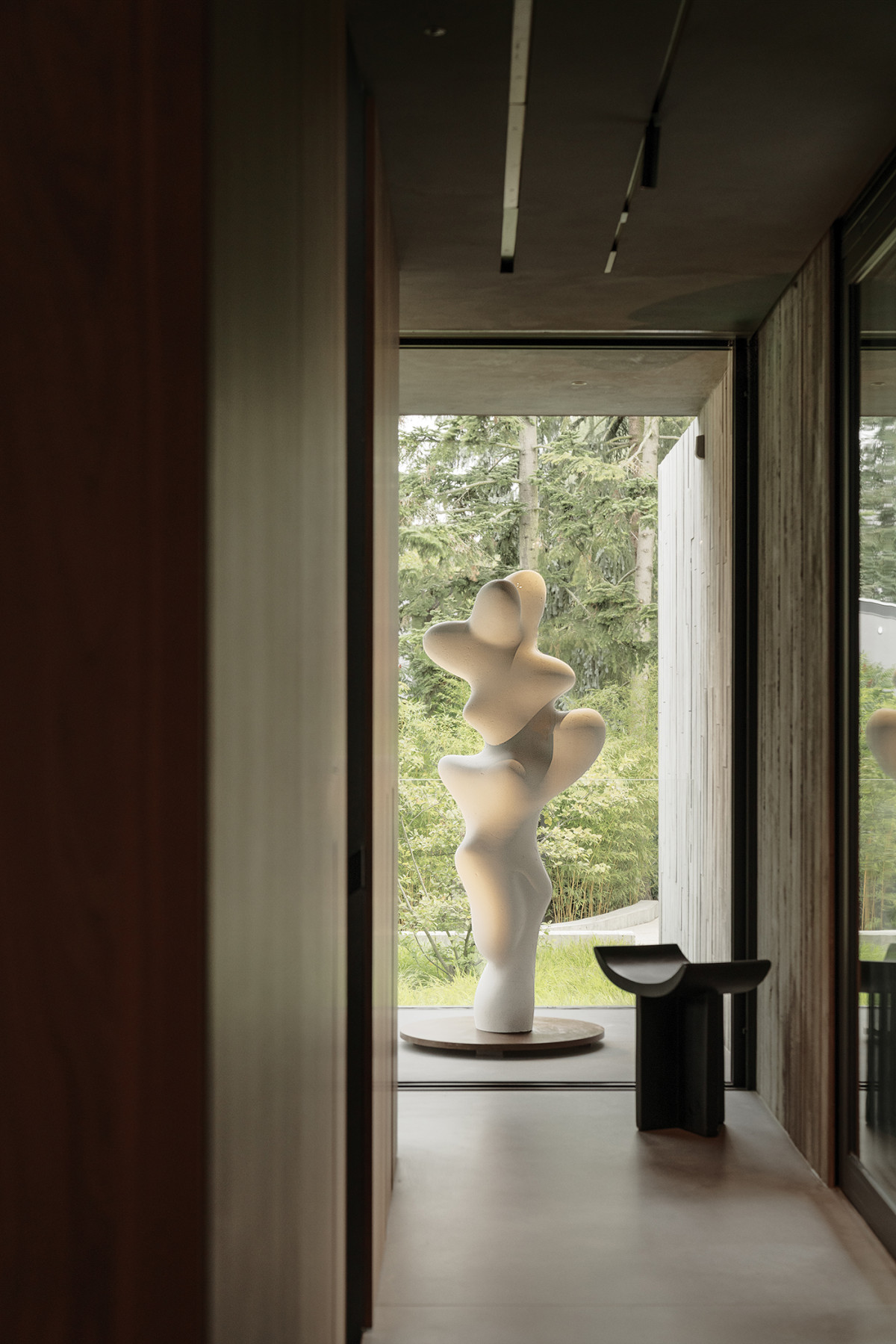 Na zamknięciu korytarza, podobnie jak w pawilonie Miesa, ustawiono rzeźbę – „Playfulness” Wojtka Iłendy. Obok stołek „Brutus” ze 101 Copenhagen. Zdjęcie: Tom Kurek